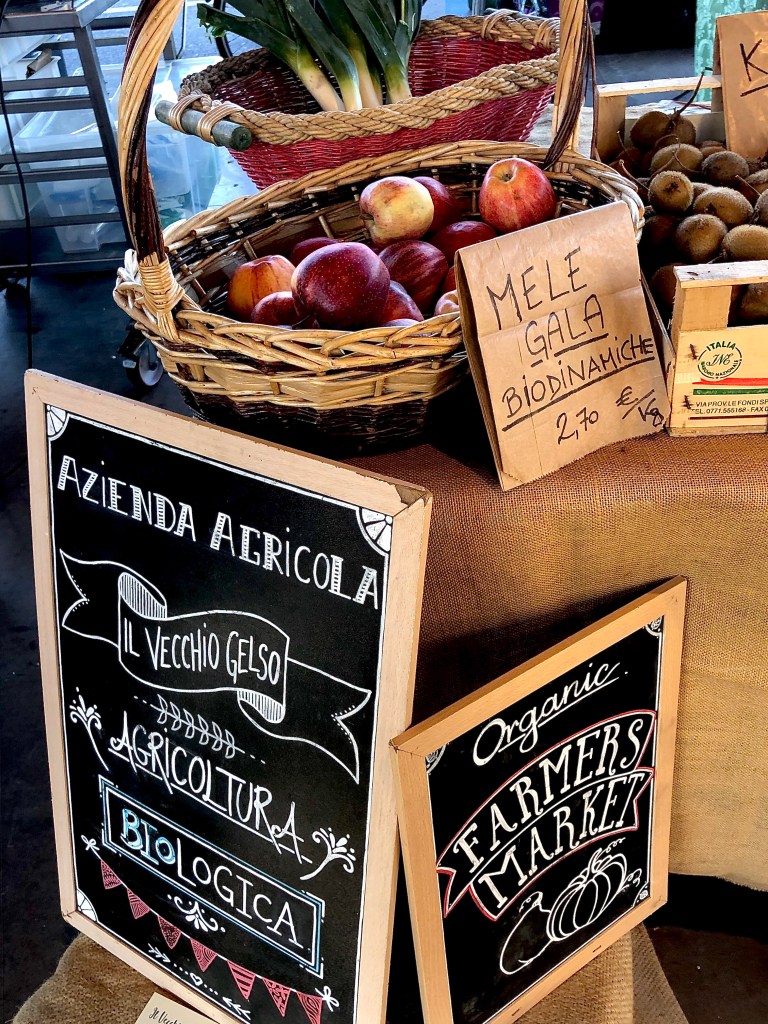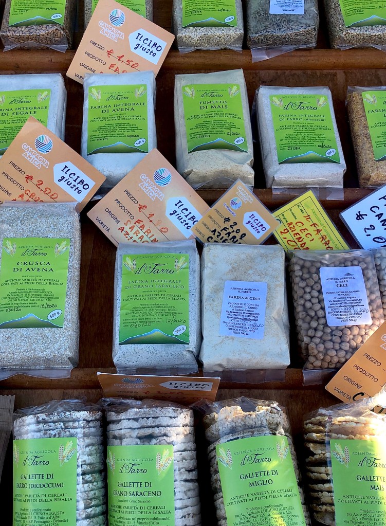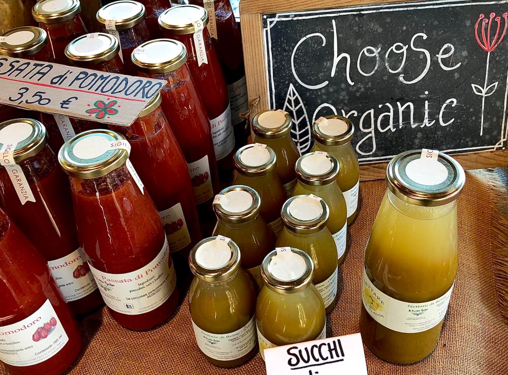 Finally, I stopped off at the beautifully presented stall of Azienda Agricola Il Vecchio Gelso, one a small number of producers selling organic produce grown locally on their farm near Bastia Mondovi. We chatted about the benefits of being able to sell products such as juices and sauces in the farmer’s market as well as directly from the field. What became clear is that whilst it takes time to build relationships with the local community, these relationships go well beyond the exchange of goods. The farmer’s market provides an opportunity to engage on local isues, to socialise, to make new friends and, where necessary, mobilise to improve conditions for producers and consumers alike.