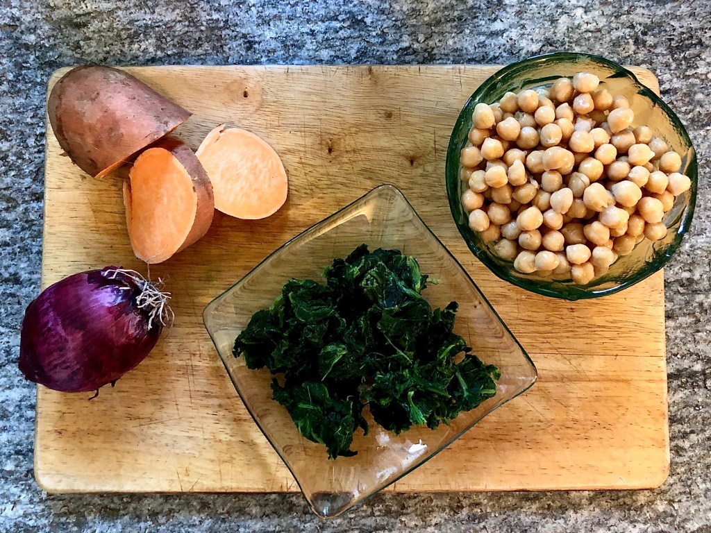 A large sweet potato A red onion Some spinach - I only had frozen which works fine in this recipe A tin of chickpeas A tin of tomatoes A tin of coconut milk 1 tbsp garam masal or curry powder 2 tsp ground coriander A vegetable stock cube