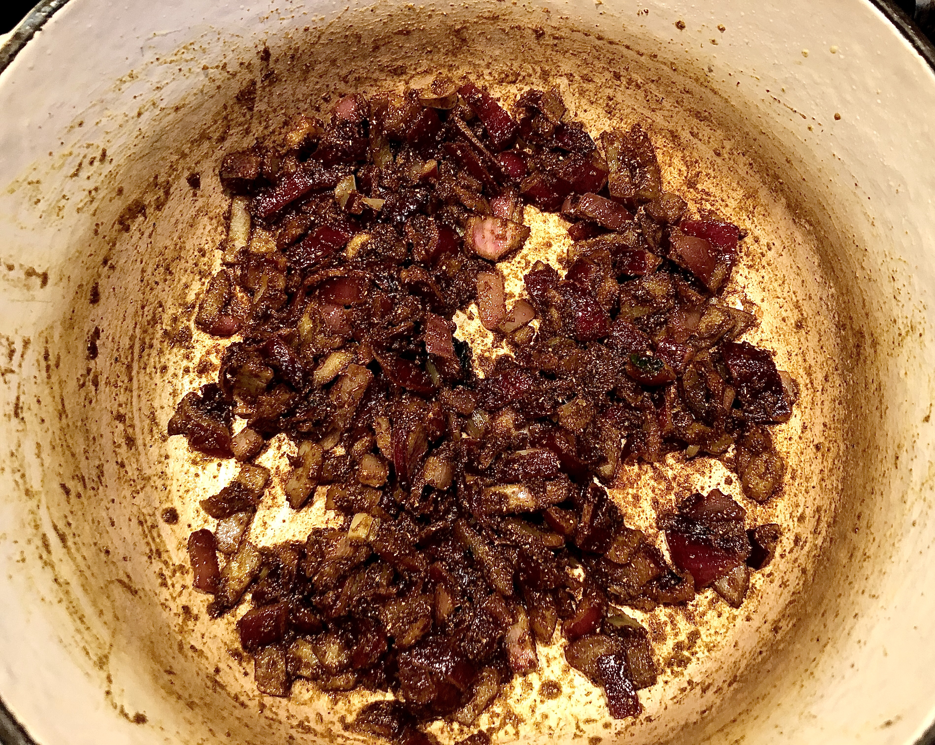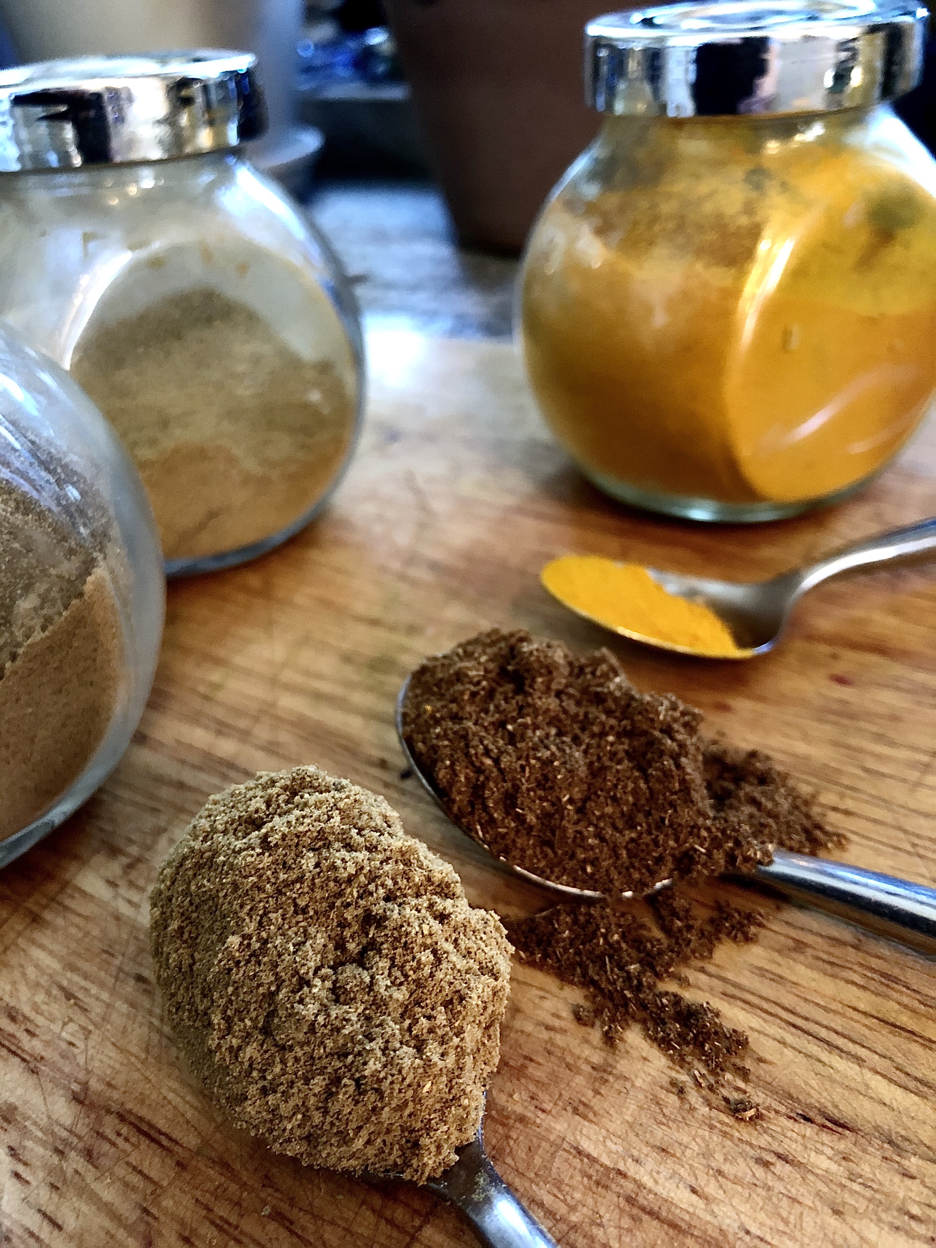 First, roughly chop the sweet potato and spinach and finely chop the onion which you then fry off with the spices. I use coconut oil for my Indian cooking – it’s lighter than olive or vegetable oil and enhances the flavours – but any oil will do. Don’t stress about the amount of spices, I always end up adding more! And if you don’t have separate spices just double up on the curry powder. Either way your kitchen will be full of wonderful smells at this point!