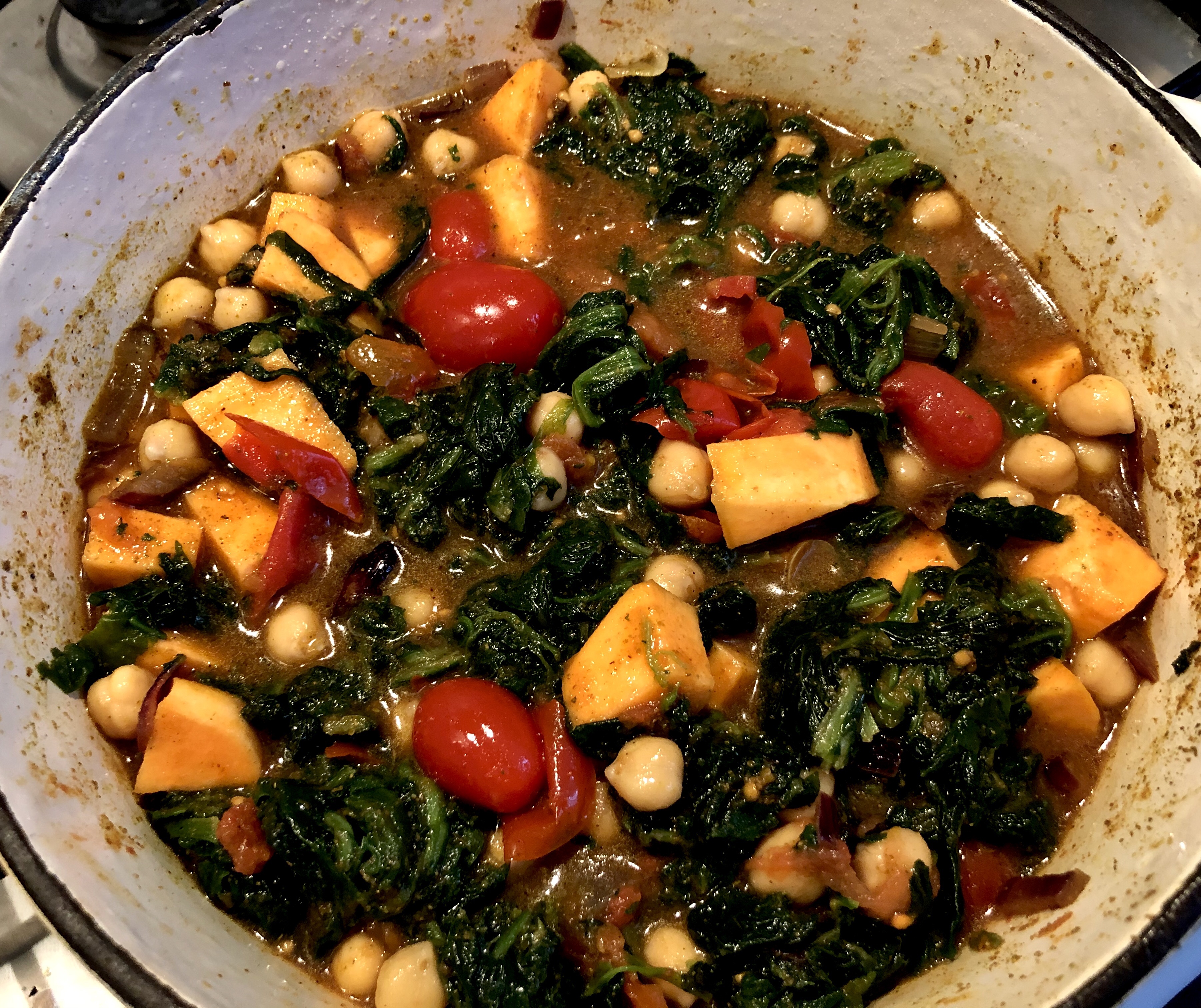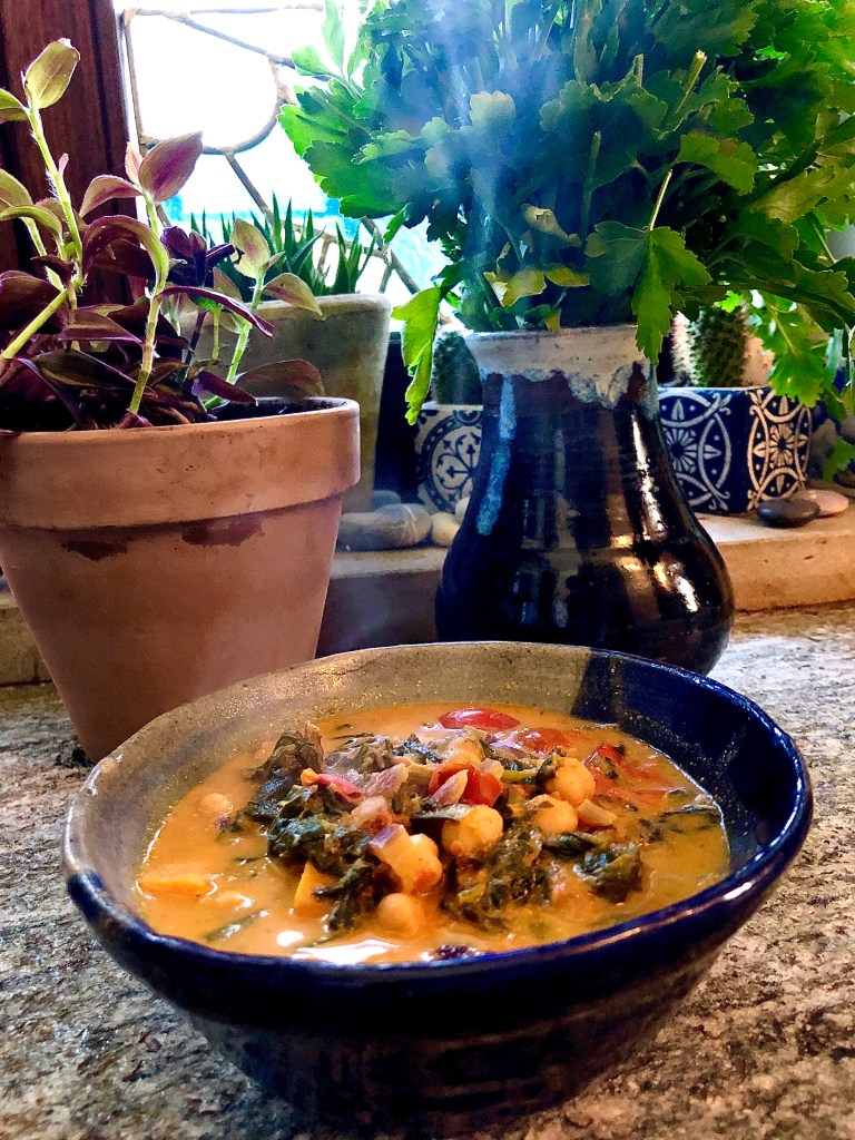 This is one of my favourite dishes. With spices and coconut, it has its roots in India but if you are not a curry maker or lover don’t be put off…this dish is all about taste not heat. It’s basically a bowl of creamy vegetarian/vegan deliciousness that can be eaten like a stew or served with rice or a fluffy baked potato if you need more carb!