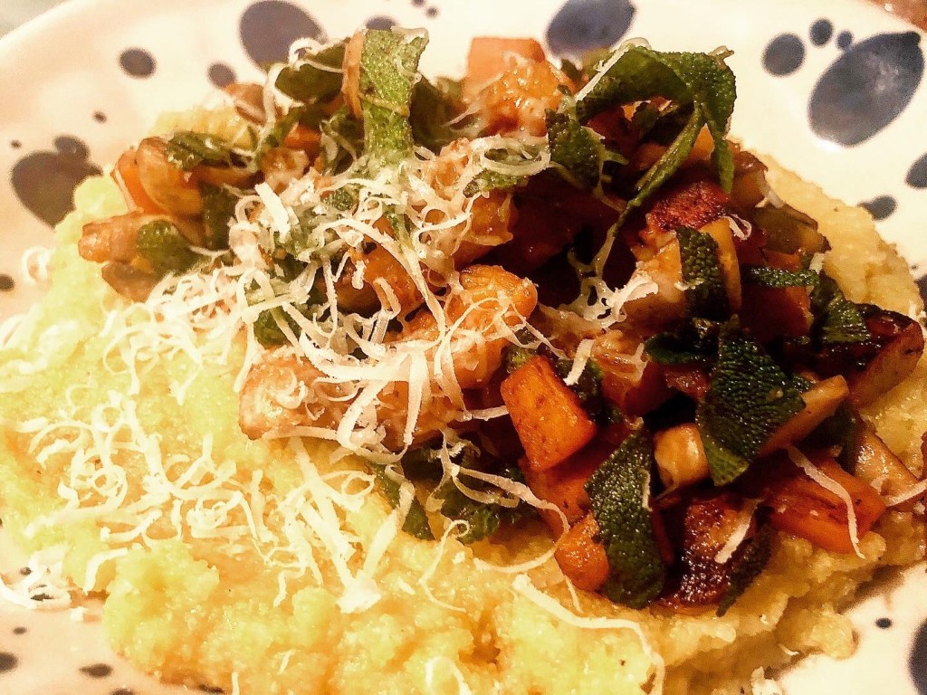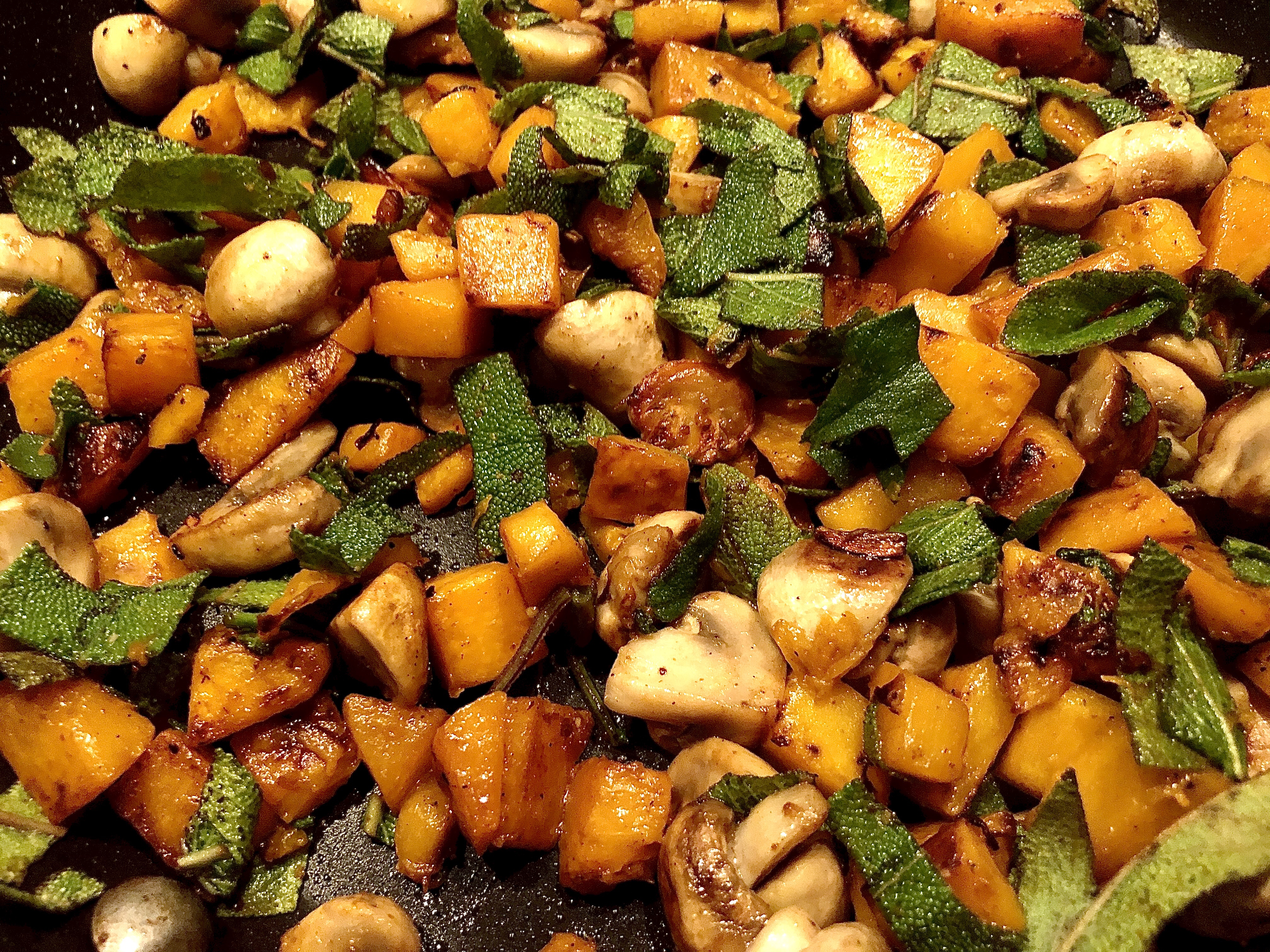Whilst the polenta is bubbling away chop up the veggies and fry them off in butter starting with the pumpkin which needs a little bit longer than everything else. It should be nice and soft, just starting to caramelise, which for me took around 15 mins. Add your chopped mushrooms and finally the sage, seasoning well. I also added a splash of water at this stage to keep everything nice and moist.