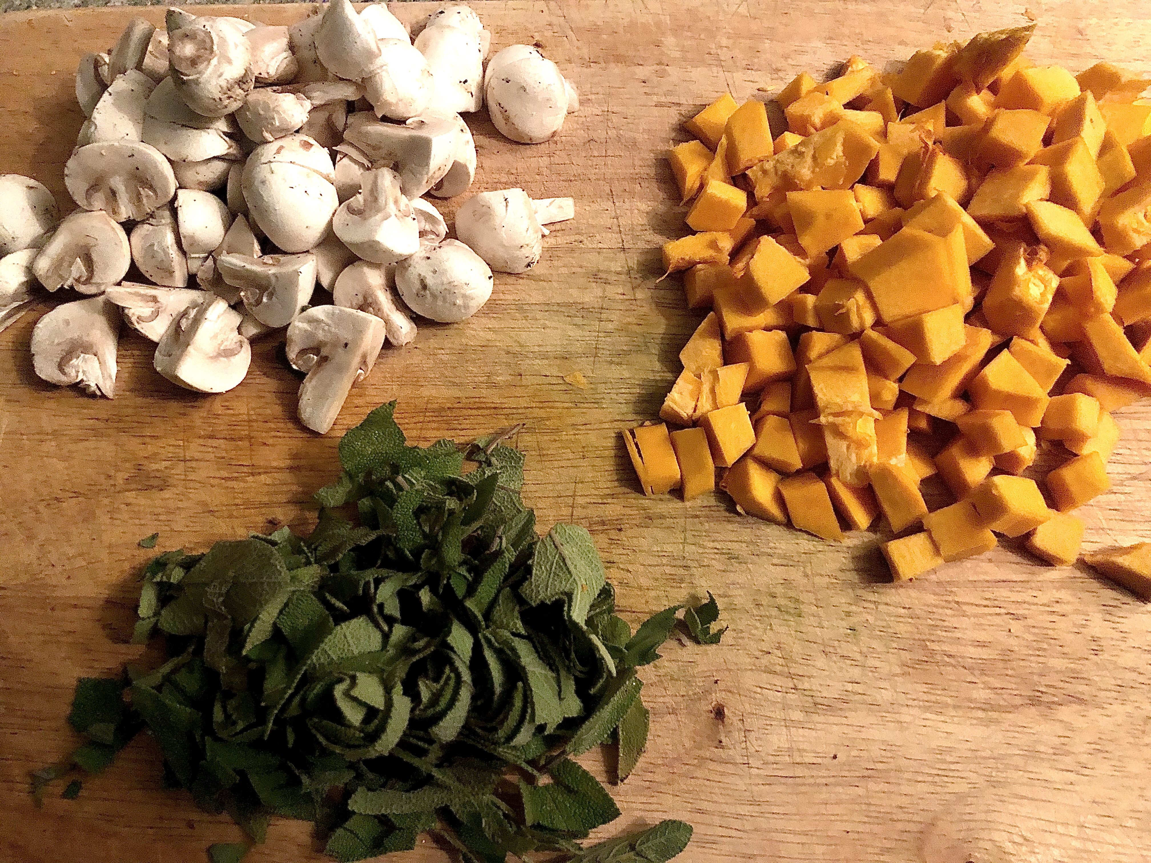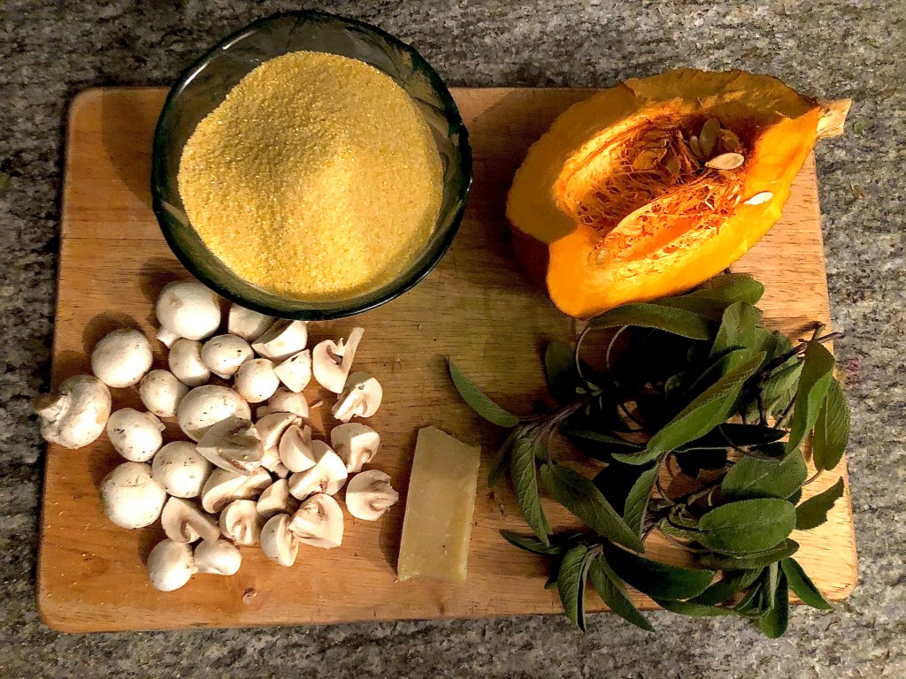1 cup of dried polenta A chunk of pumpkin or butternut squash Mushrooms A good handful of fresh sage leaves A vegetable stock cube A chunk of Parmesan cheese Butter Salt and pepper