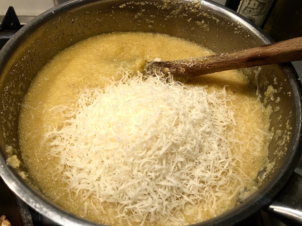 First, boil a kettle and make your vegetable stock, add your polenta to a pan, pour the stock on top and mix well over a low heat. The amounts are always a bit hit and miss for me, I just keep adding liquid until the polenta is thick and creamy but not too think or ‘dry’. The amount of fluid needed and the time it takes to cook varies hugely depending on the courseness of the polenta. In this case mine took about 20 minutes as well the polenta was very fine. When it’s done add a good handful of grated Parmesan cheese and a knob of butter and season well.