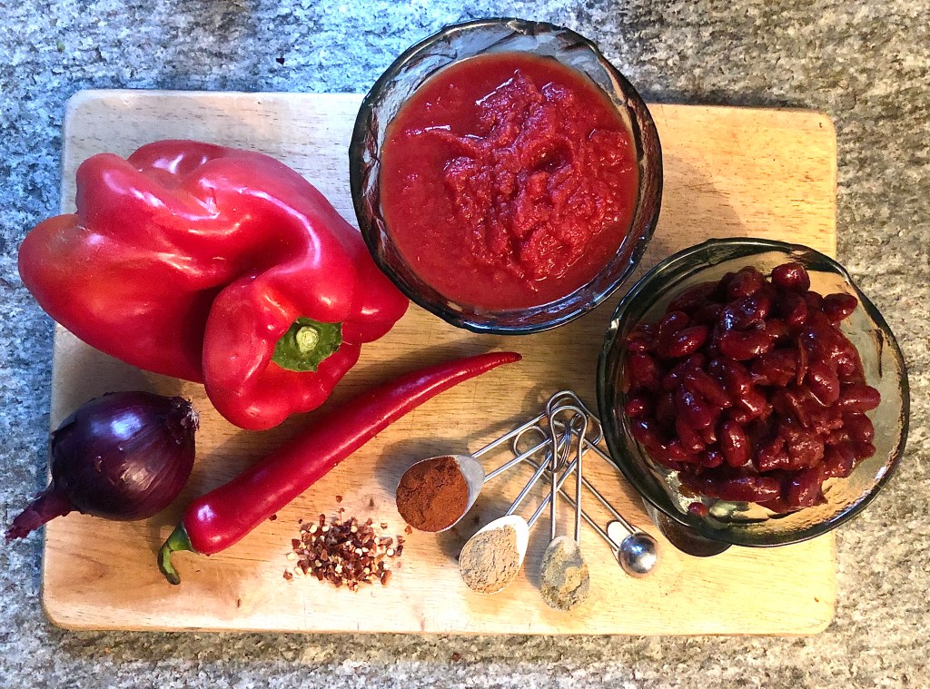 Tin of chopped tomatoes Tin of kidney beans 1 large red pepper 1 red onion 1 tbsp paprika 1 tsp coriander 1/2 tsp cumin Chilli flakes to taste A vegetable stock cube (optional)