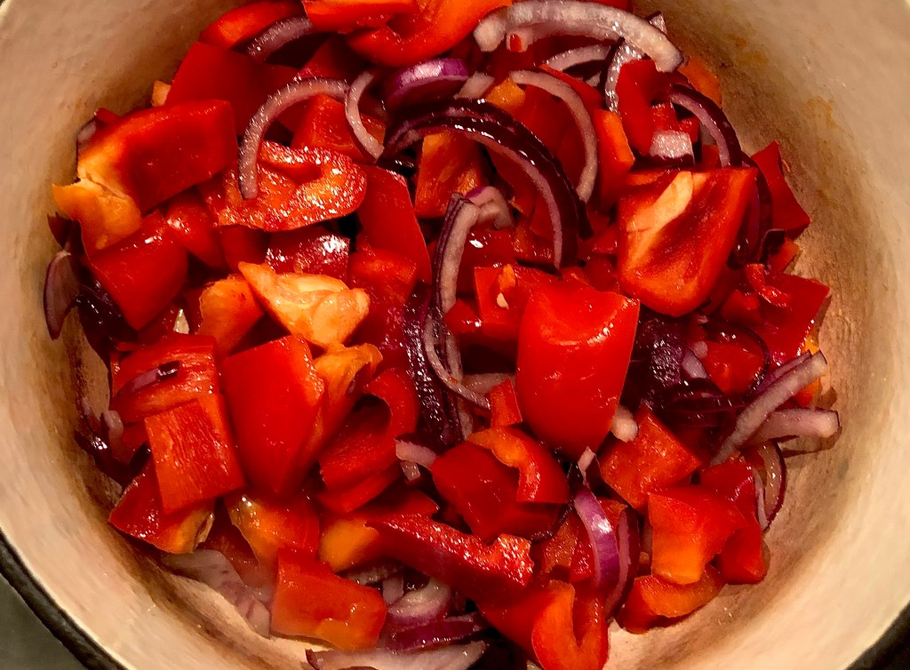First, slice the onion, pepper and chilli. Don’t forget to wash your hands carefully afterwards….there really is nothing worse than accidentally rubbing your eye without doing so, believe me I’ve done it many times!