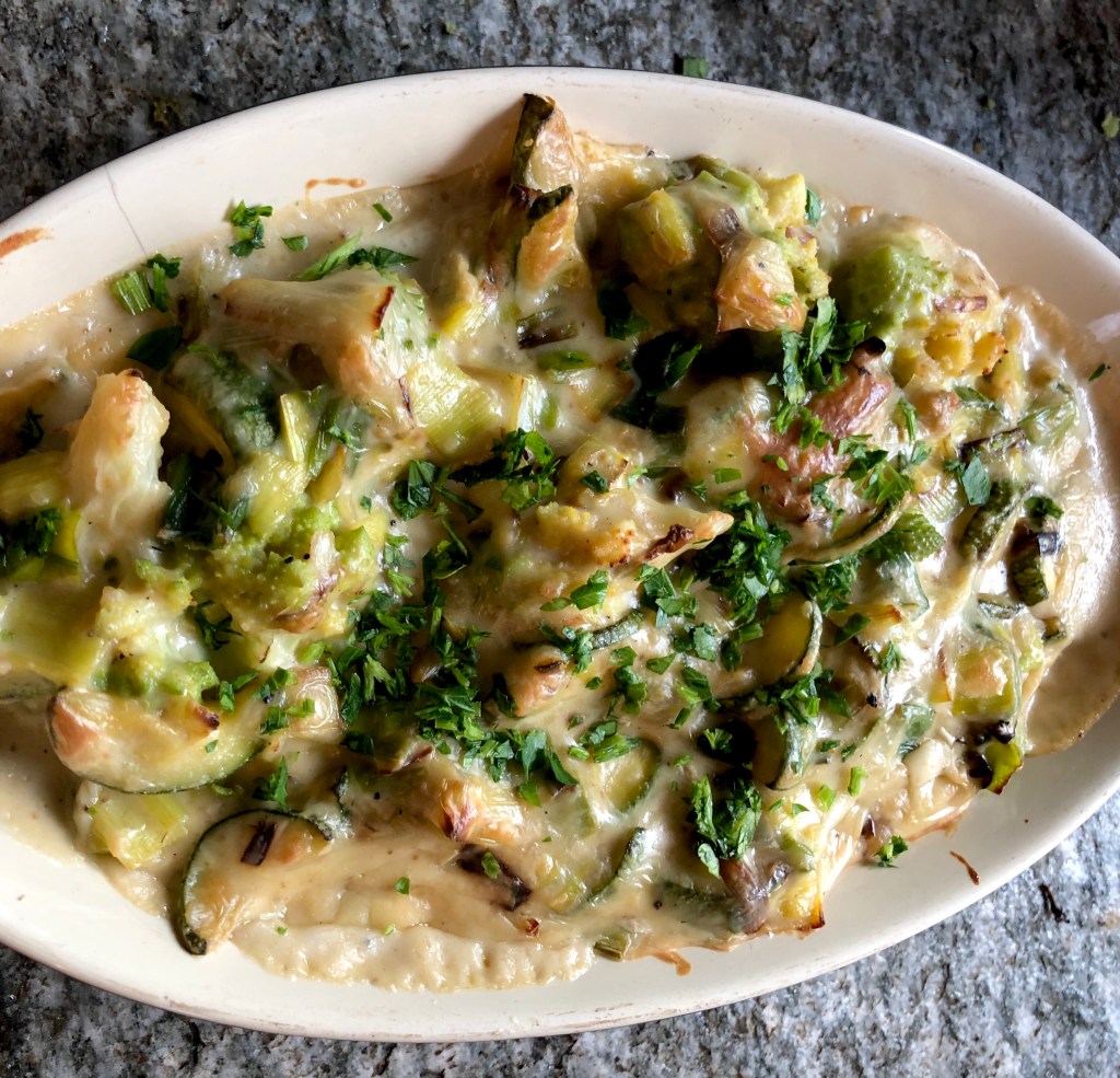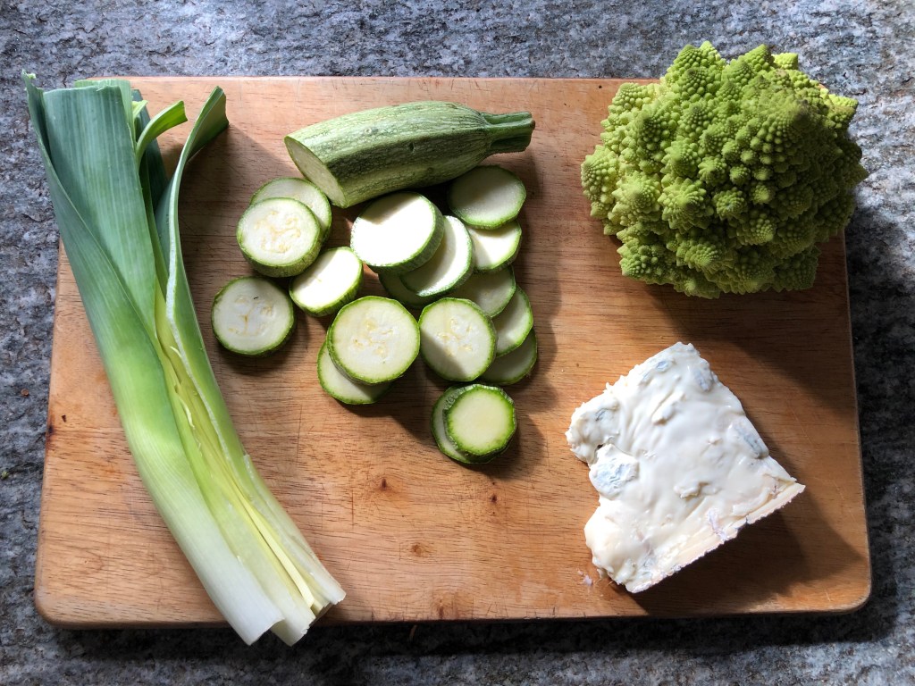 Here in Northern Italy we are heading into week four of our COVID-19 lockdown and after a busy work week of project management and video calls it’s nice to be able to spend some time in the kitchen cooking up some veggie comfort food. I made this dish with a Romano cauliflower which is truly a thing of beauty and some delicious creamy Gorgonzola cheese but you can also use a normal cauliflower and another strong cheese such as cheddar if you prefer. And you can mix up the veggies – I added leeks and courgettes but mushrooms also work well.