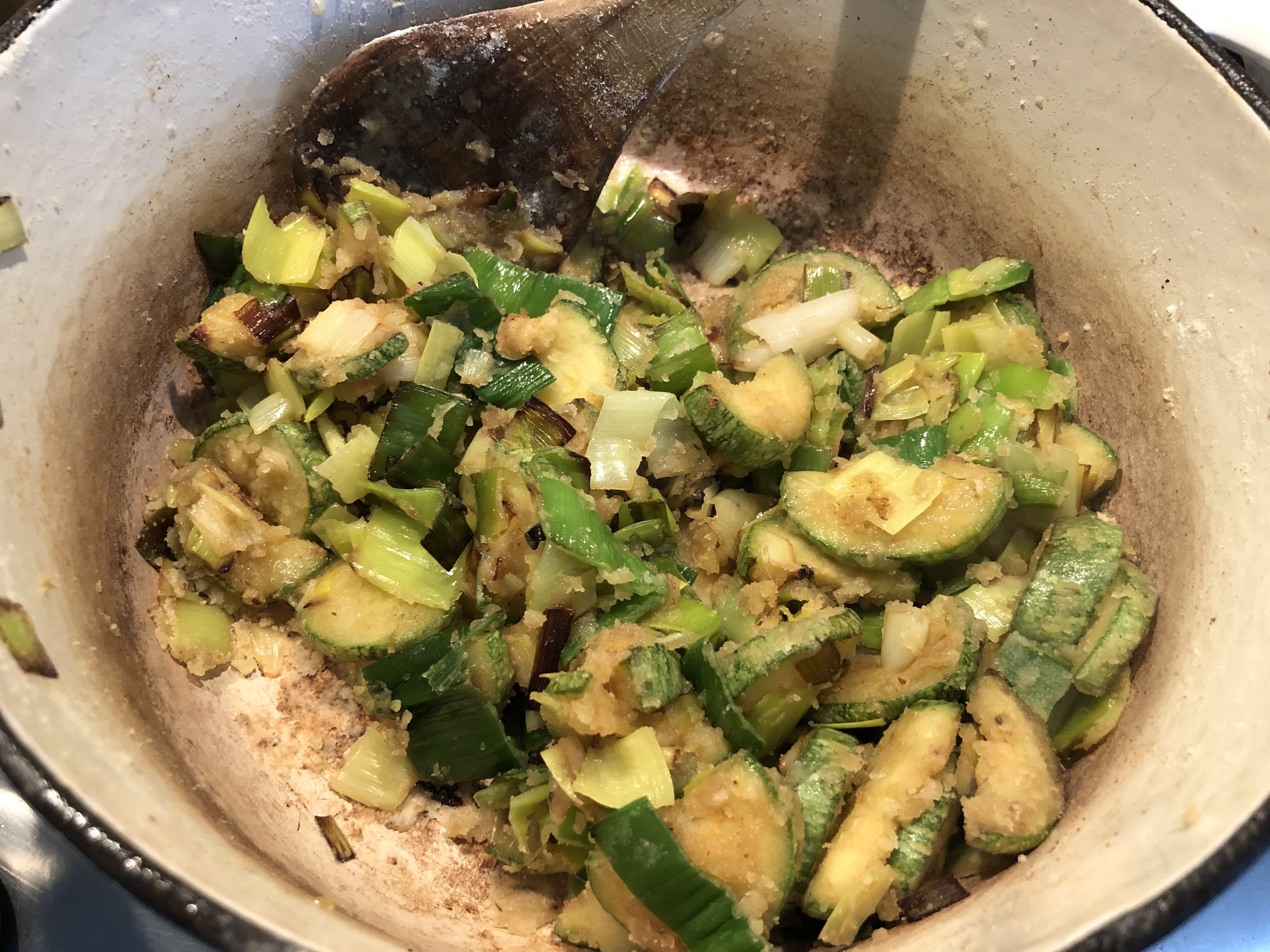 First chop your veggies. It really doesn’t matter how precisely you do this…I sliced the courgettes and leeks and broke the cauliflower into florets.