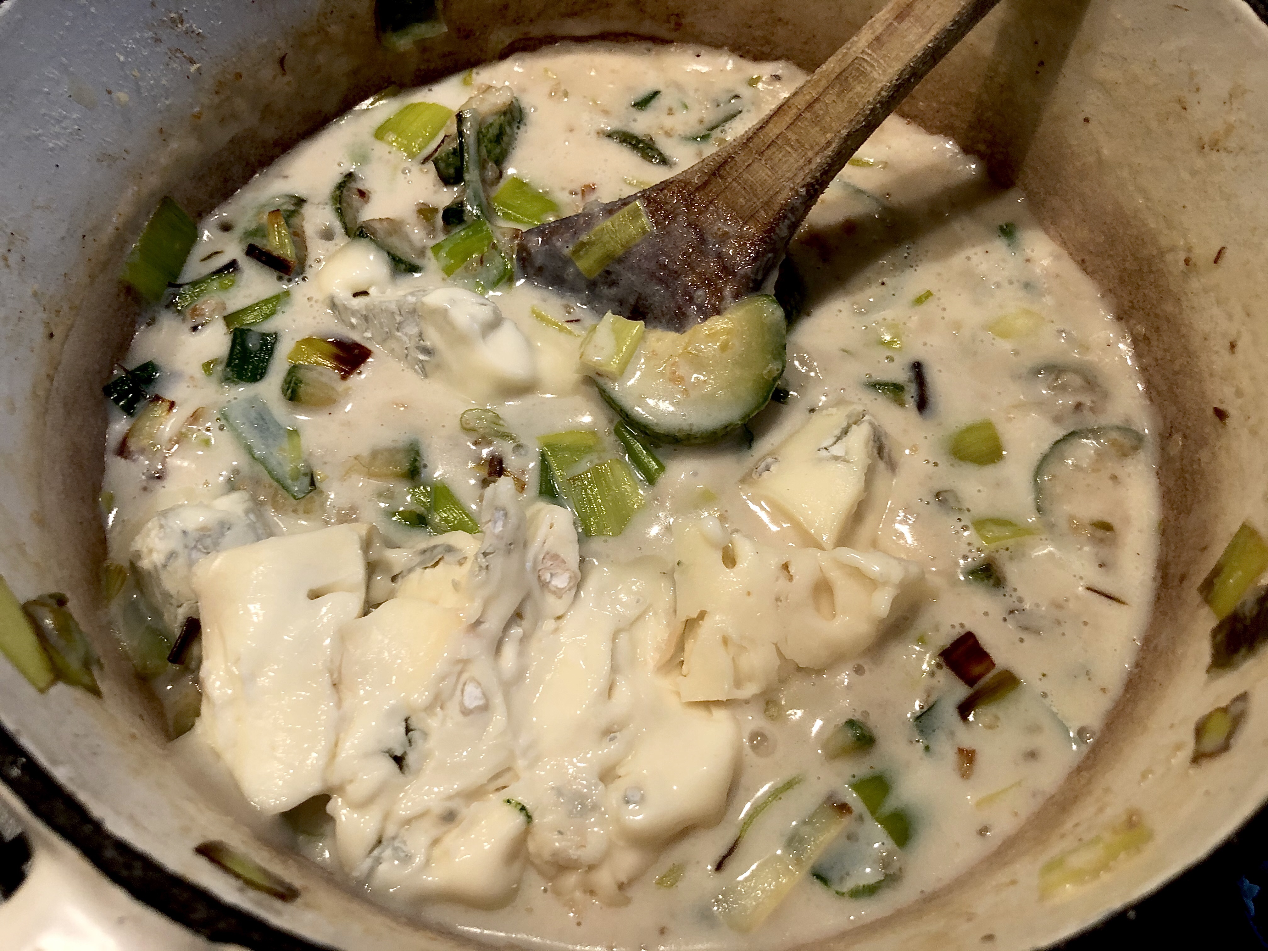 A cauliflower A large leek Two courgettes and/or a handful of mushrooms A chunk of Gorgonzola (or cheddar) cheese Butter 3 tbsp plain flour 1/2 litre milk (any type) Salt and pepper