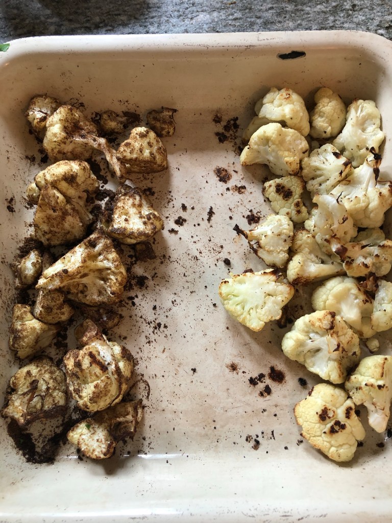 First chop the caulifower into florets and place on a baking tray with oil, salt and pepper and garlic powder to taste. Mix well. Divide into two, mixing the cumin and garam masala into one half and leaving the other half plain. Roast in a hot oven for 20 mins or until the cauliflower starts to brown.