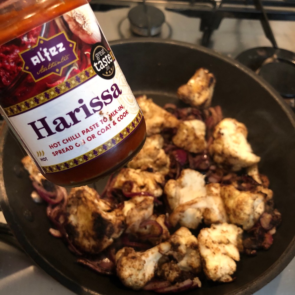 I often work quite late on weekdays and like to do some bulk cooking on the weekend so I have delicious home cooked vegetarian food to look forward to. I realise that there has been rather a preponderance of the humble cauliflower in my recent recipe posts but this is such a versatile vegetable that it’s often my ‘go to’ when I’m trying to decide what to make for the week, not least because you can produce two completely different dishes at the same time! Today I made a very ‘English’ cauliflower cheese but with a Gorgonzola and mushroom twist and a spicy ‘Moroccan-Indian’ cauliflower dish with red onions, harissa (chilli paste) and pomegranate jewels, both from a single roasted cauliflower.