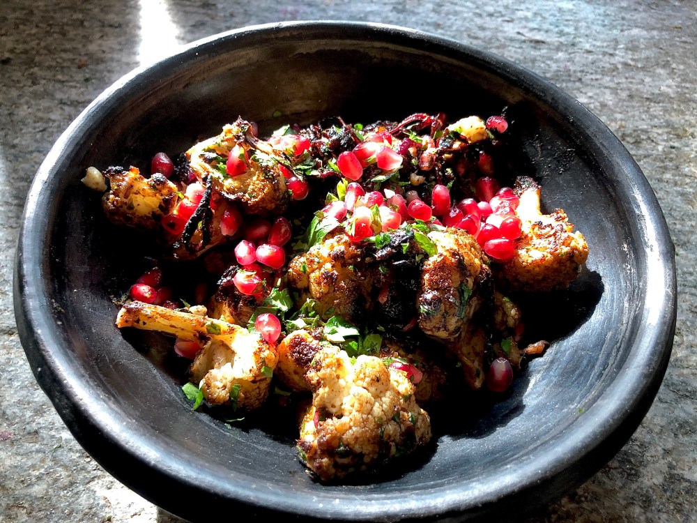 For the spicy cauliflower dish, finely slice a red onion and fry off in the oil. Add the roasted spicy cauliflower together with the harissa paste and pomegranate molasses. Season well before turning into a bowl. Sprinkle with pomegranate seeds and parsley. This dish can be served hot with flatbread or pitta, or cold as a salad.