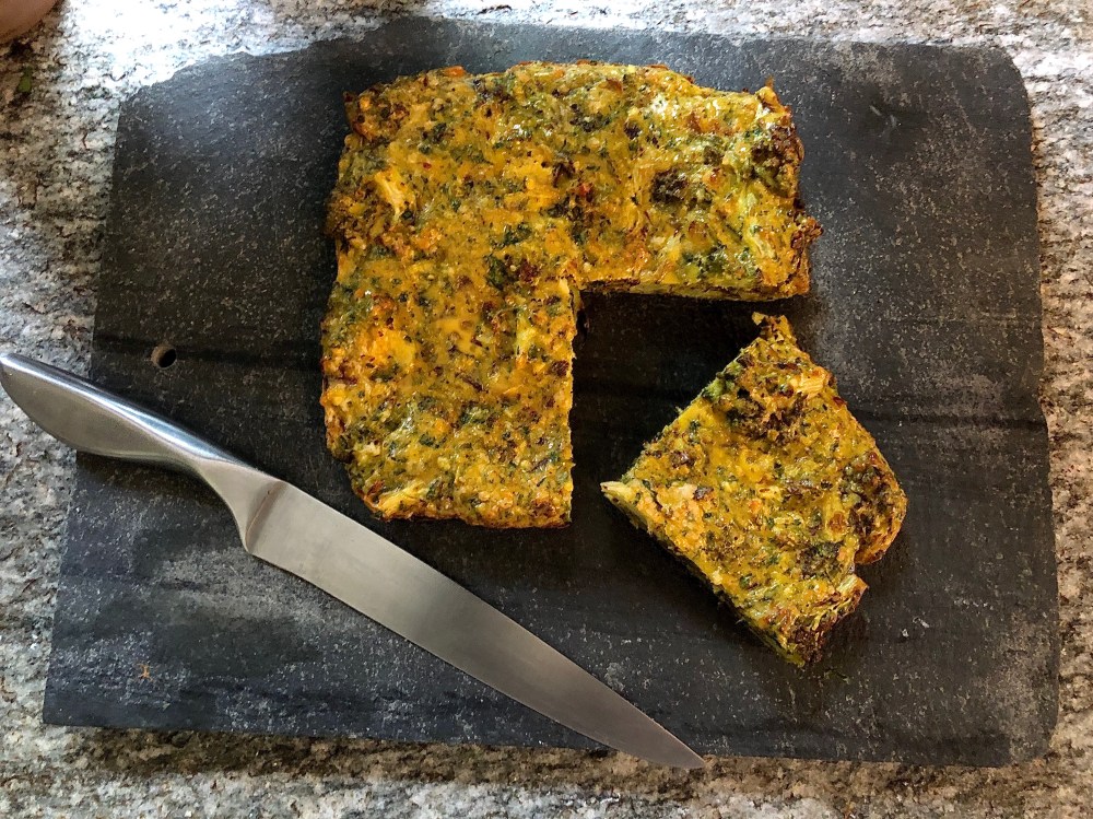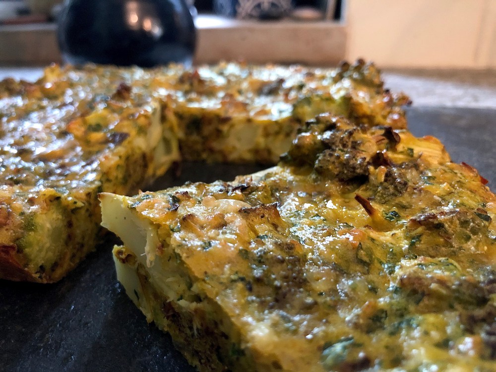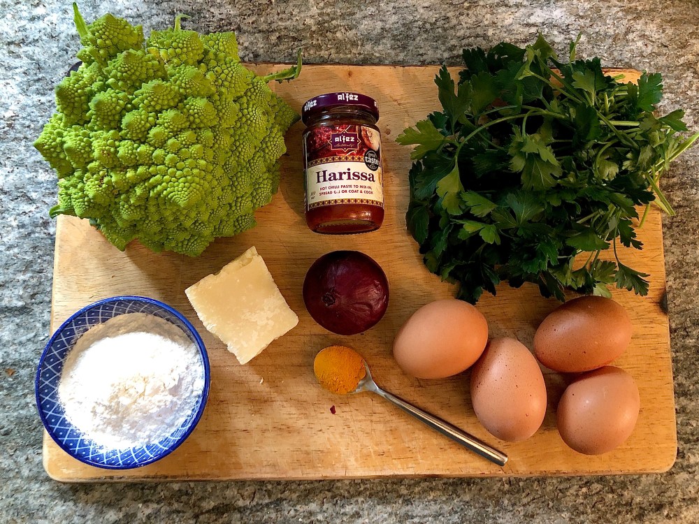 A small cauliflower - I used a beautiful Romano but any type is fine A red onion A handful of any leafy green herbs, finely chopped - I used parsley 1 1/2 tsp harissa paste 1 tsp tumeric A couple of cloves of garlic or a squirt of garlic paste 4 tbsp self-raising flour 4 tbsp grated hard cheese - as I'm in Italy I used Grana Padano 4 eggs Salt and pepper to taste Butter to fry off the onion and grease the flan dish