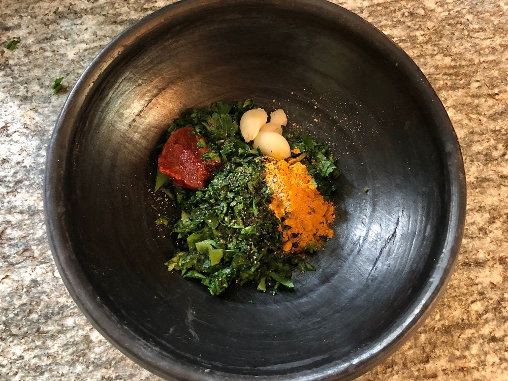 Next, chop the herbs and put in a bowl with the tumeric, harissa paste, garlic, salt and pepper. Mix well. Chop and fry off the onion in a little butter and then add the herby spice mixture and cook for 2 minutes.