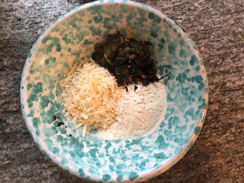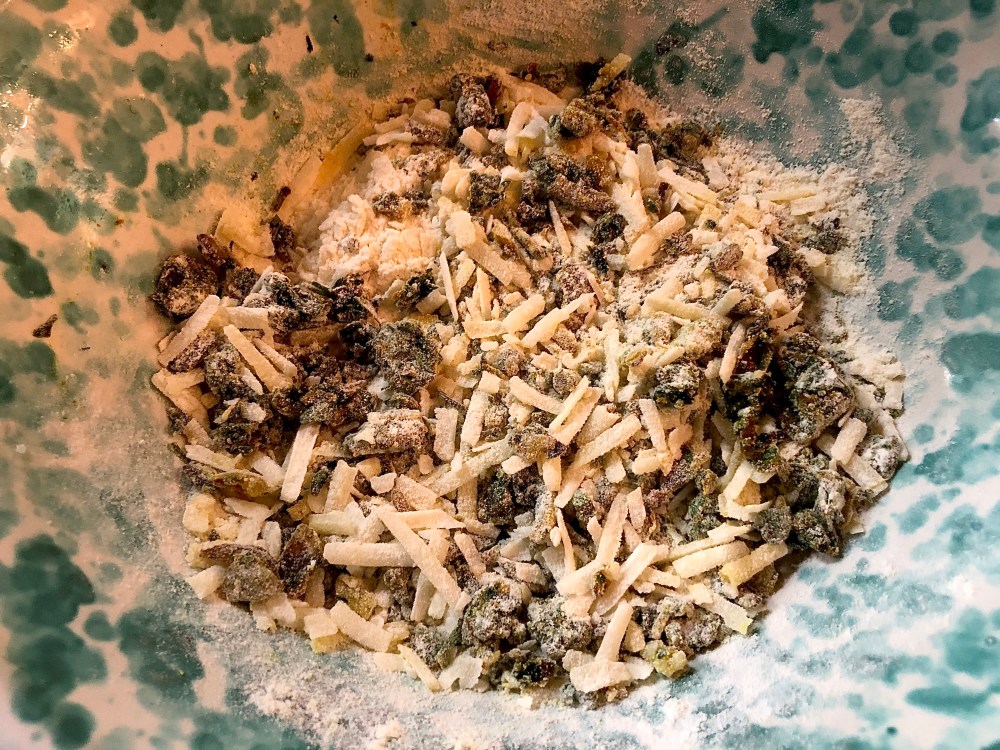 Mix together the flour and grated cheese in a bowl, then add the herby spice mixture, the eggs (beaten) and roasted cauliflower. Combine well and spoon into a greased flan dish.
