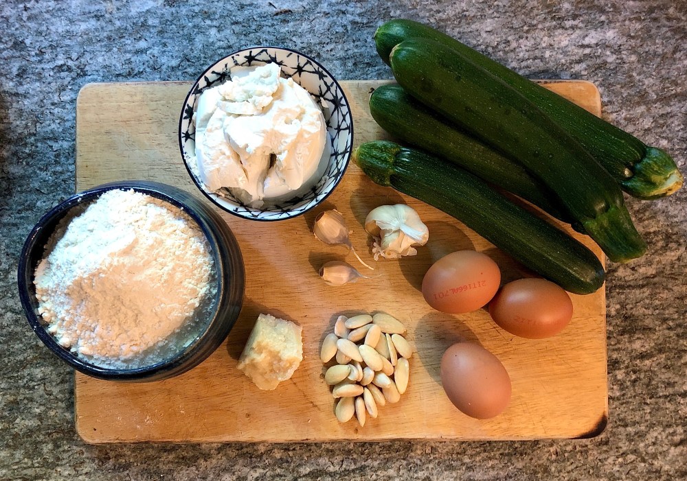 300g plain flour 3 large eggs 250g ricotta cheese grated nutmeg 4 large zucchini (courgettes) 2 cloves of garlic A chunk of parmesan A handful of peeled almonds (optional) Olive oil
