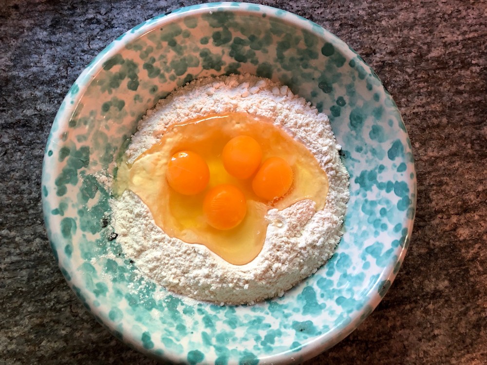 We started by making the pasta. Put 300g plain flour in a bowl, make a well in the middle and crack in the eggs. Mix with a fork until the ingredients start to stick together and then turn onto a smooth board. Work the mixture until it comes together and forms and smooth pliable dough. Cover with film or put in a plastic bag and allow to rest for 30 minutes.