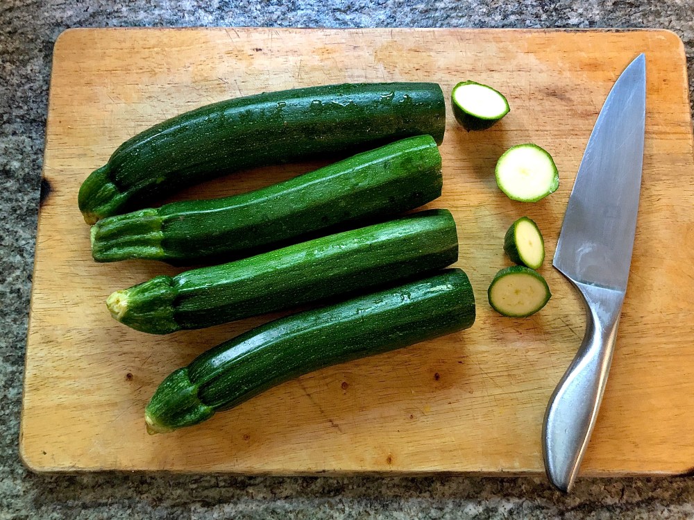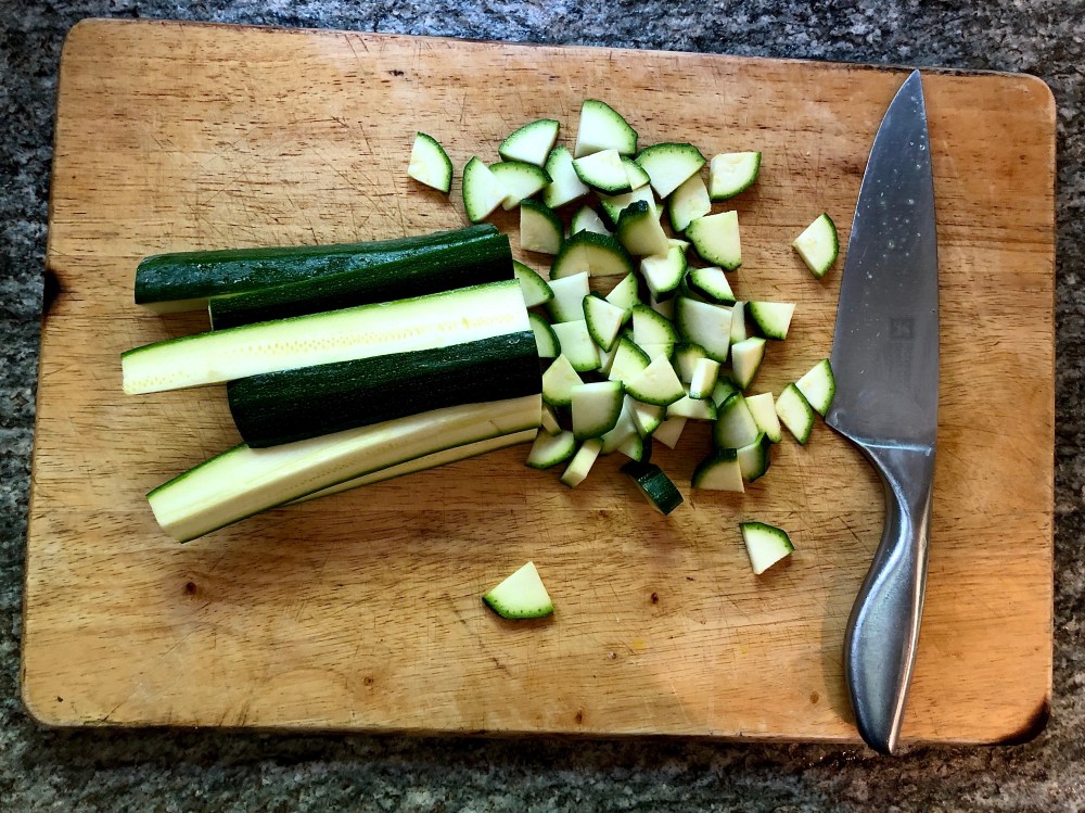 Whilst the pasta is resting prepare the sauce. First, chop the zucchini into small cubes.