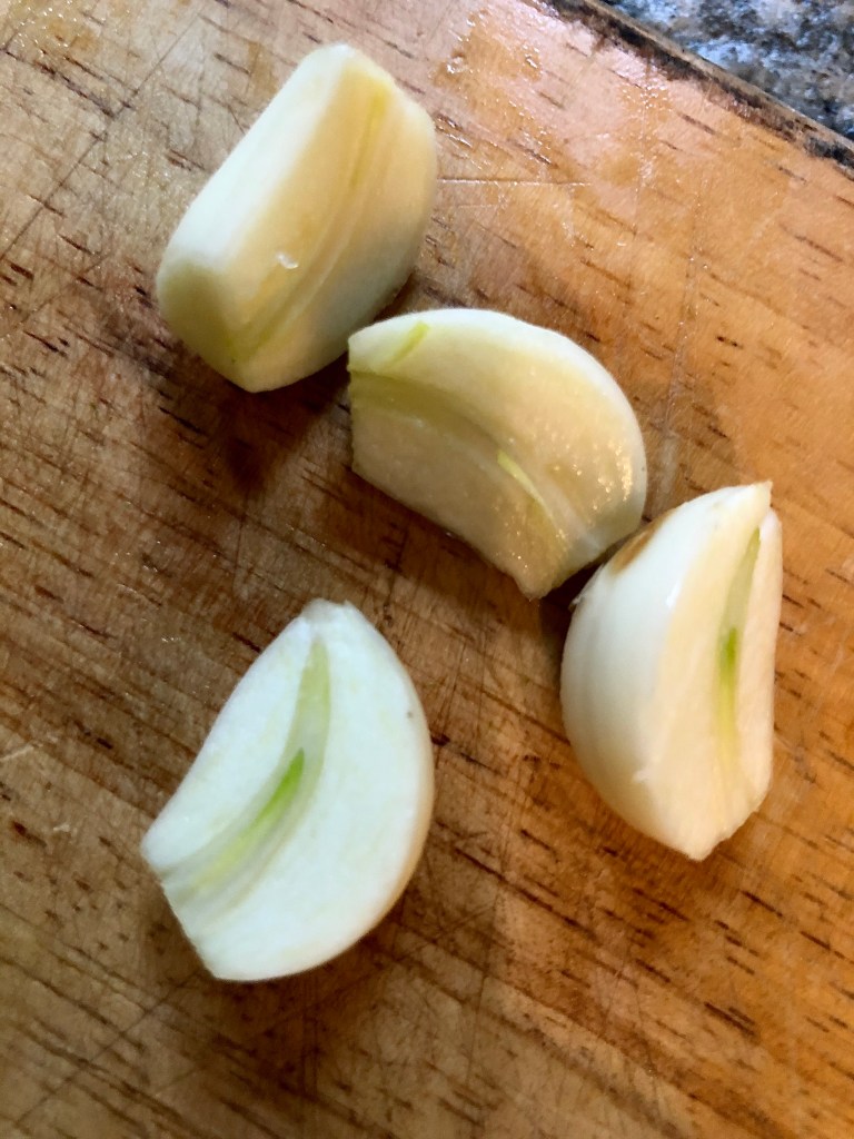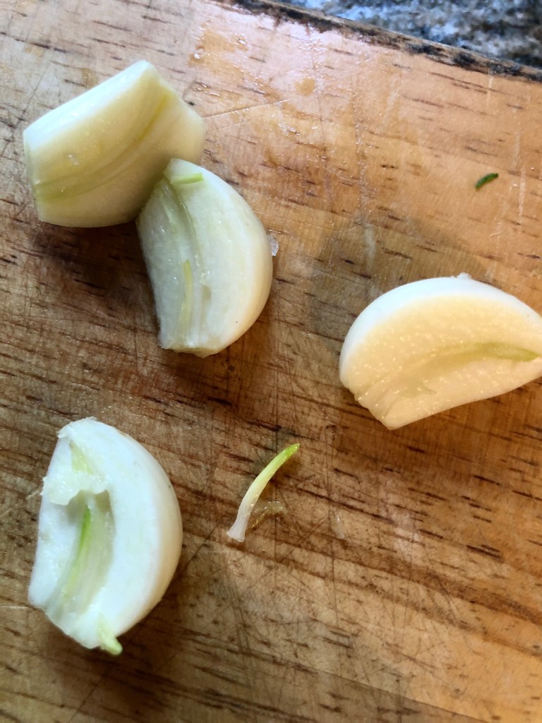 Next, peel and finely chop the garlic. A top tip from Cinzia…if you cut each clove in half and remove the germ (see photos below) the dish will taste better, particularly if the garlic is older. I’d never heard of this before but it seems that plenty of people have written about it!