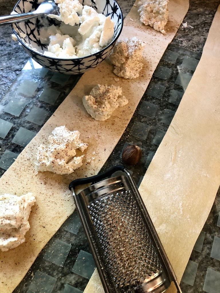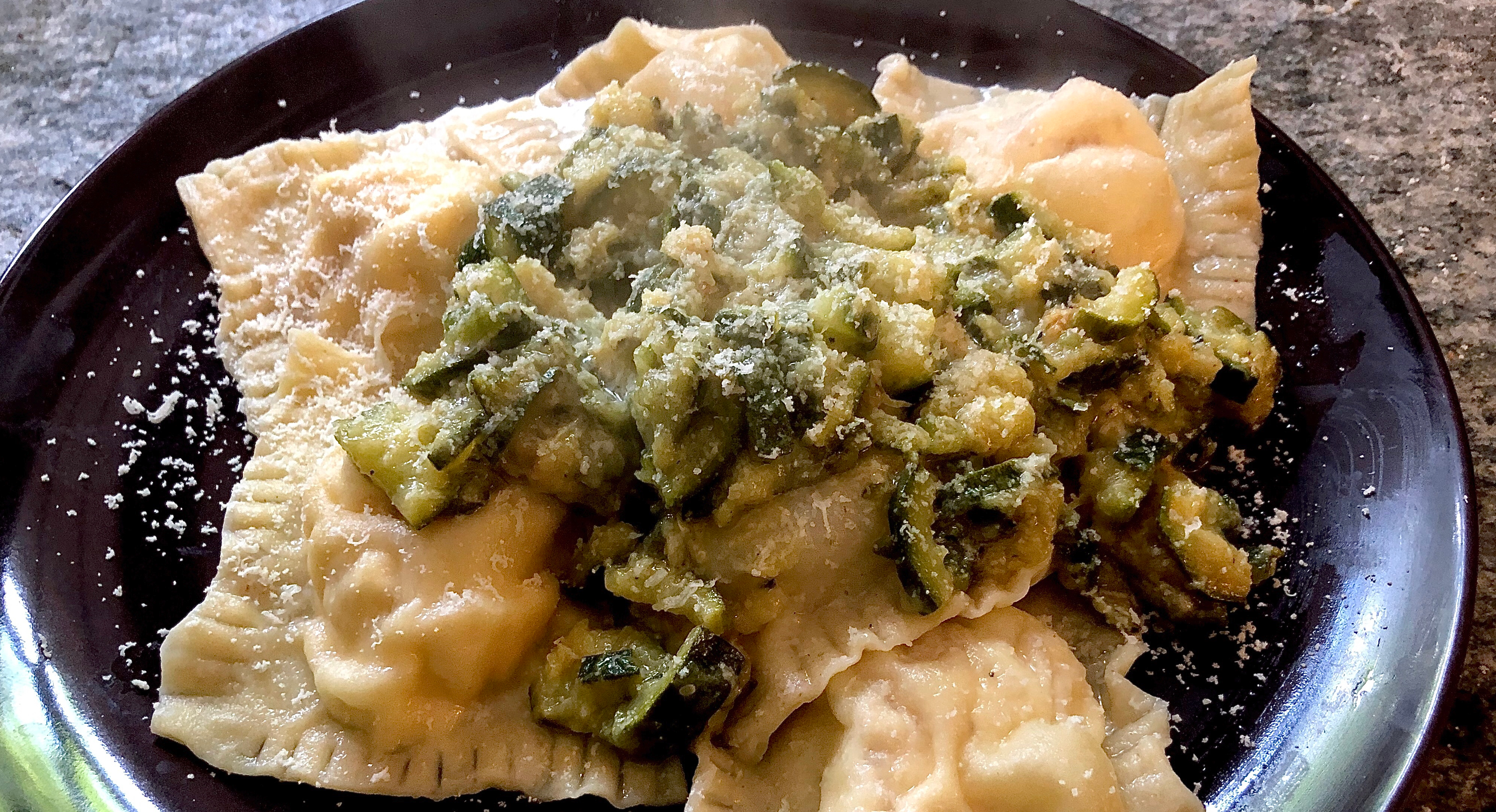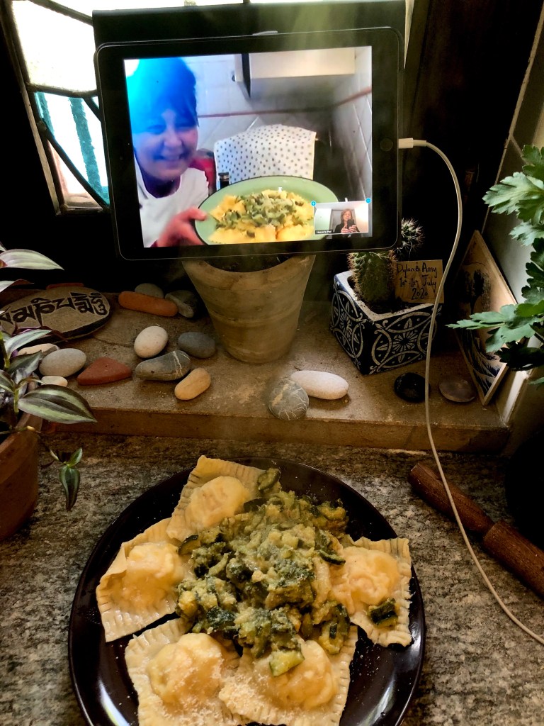 Although I live in Italy and have eaten (and loved) Italian food almost all my adult life, I’ve never actually tried to make my own pasta. Today I put that right with thanks to an online cooking lesson with Cinzia in Florence booked through Travelling Spoon. Together we made ravioli stuffed with ricotta and nutmeg served with a delicious zucchini and garlic sauce and finished off with freshly grated parmesan. I don’t have a pasta machine or any special equipment so this was made with a rolling pin and a pizza cutter!