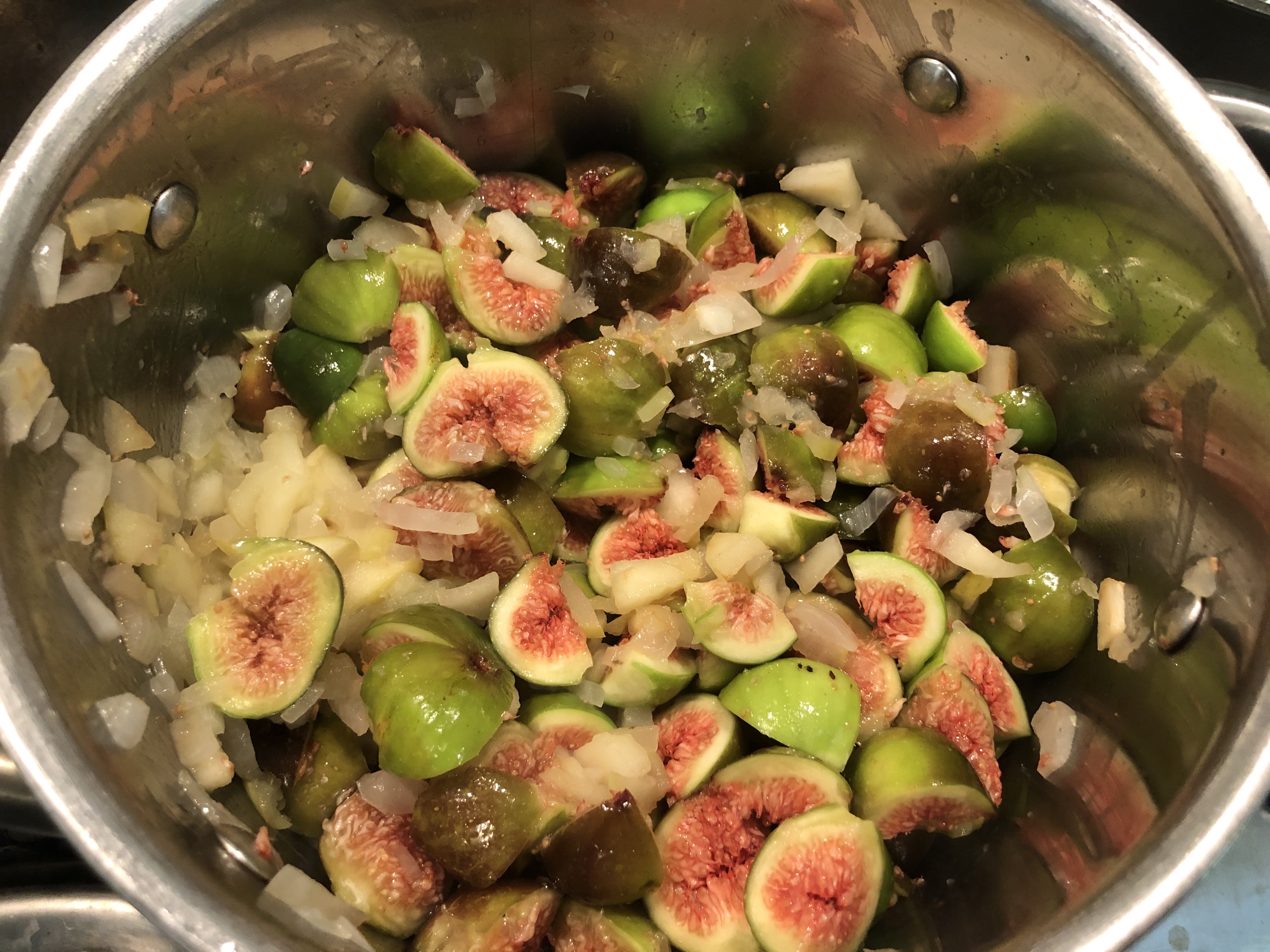Chop the onion and apple and fry off gently in a pan with a little olive or vegetable oil. I didn’t cut mine too finely as it’s nice to have some texture but you don’t want big chunks. Add the spices and cook through for a minute or two. Cut your figs into quarters. I left the skins on as they add flavour and texture.