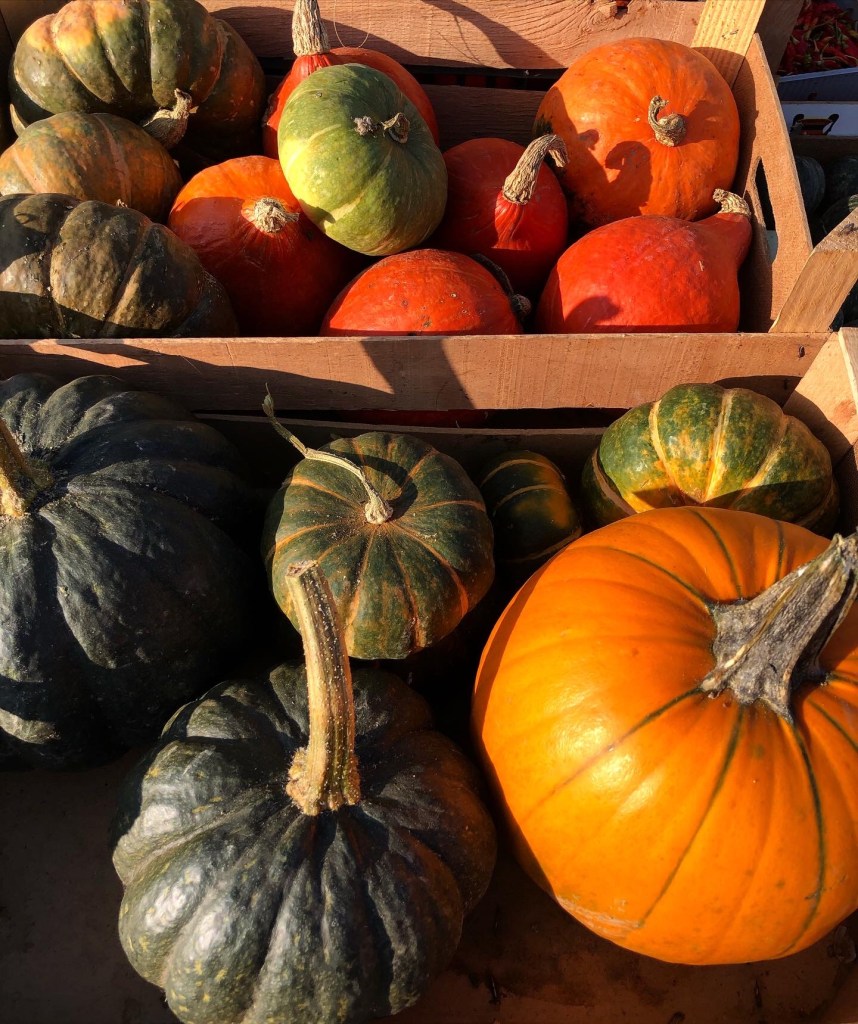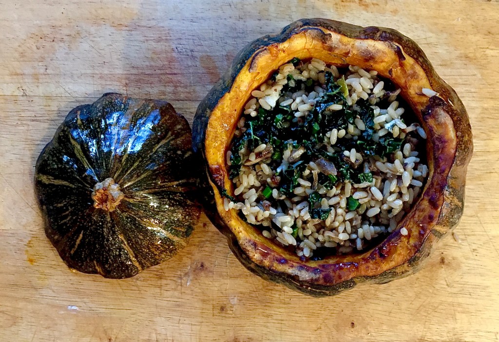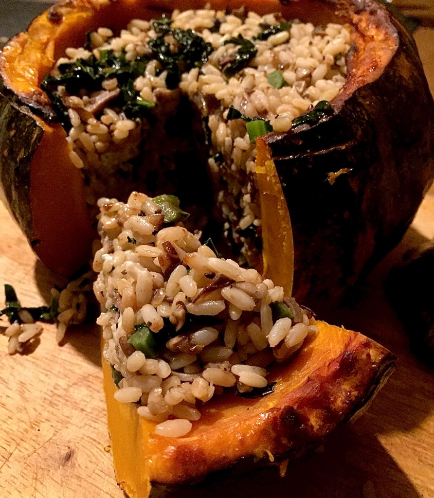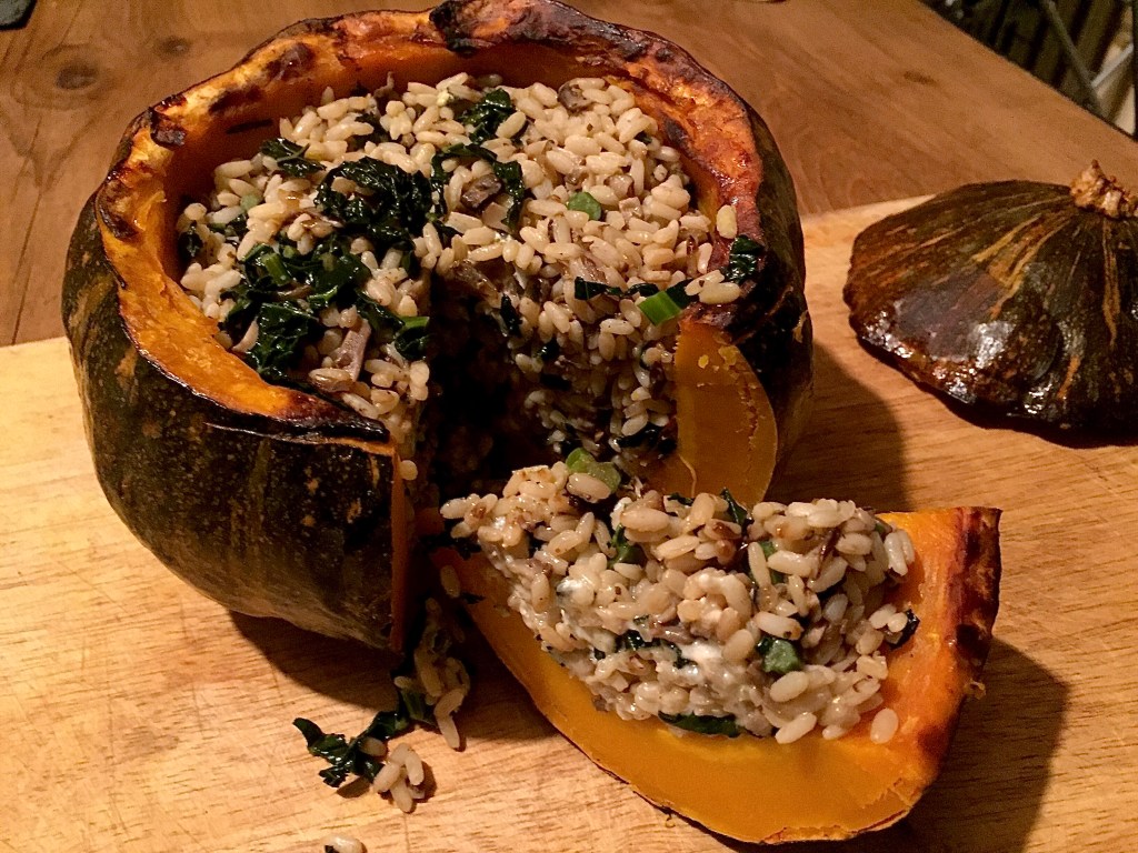 Lockdown in Italy has been tough but this weekend Piemonte turned yellow which means we are now allowed to travel outside our commune for both essential and non-essential reasons and the shops are fully open, albeit with a 6pm curfew. I don’t enjoy shopping in general but I do enjoy a trip to our local farmer’s market (mercato contadino) in Mondovi so of course that’s where we headed! As usual there was a beautiful array of local seasonal produce on display including this gorgeous selection of pumpkin and squash. I often make roasted pumpkin soup and my squash, red lentil and coconut dahl is a favourite with family and friends but this time I thought I’d try making a stuffed pumpkin as a centrepiece for a vegetarian Christmas dinner.