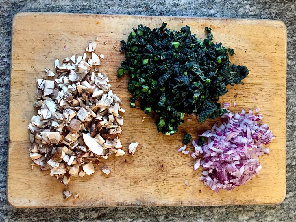 Next, finely chop the onions, mushrooms and green leaves.
