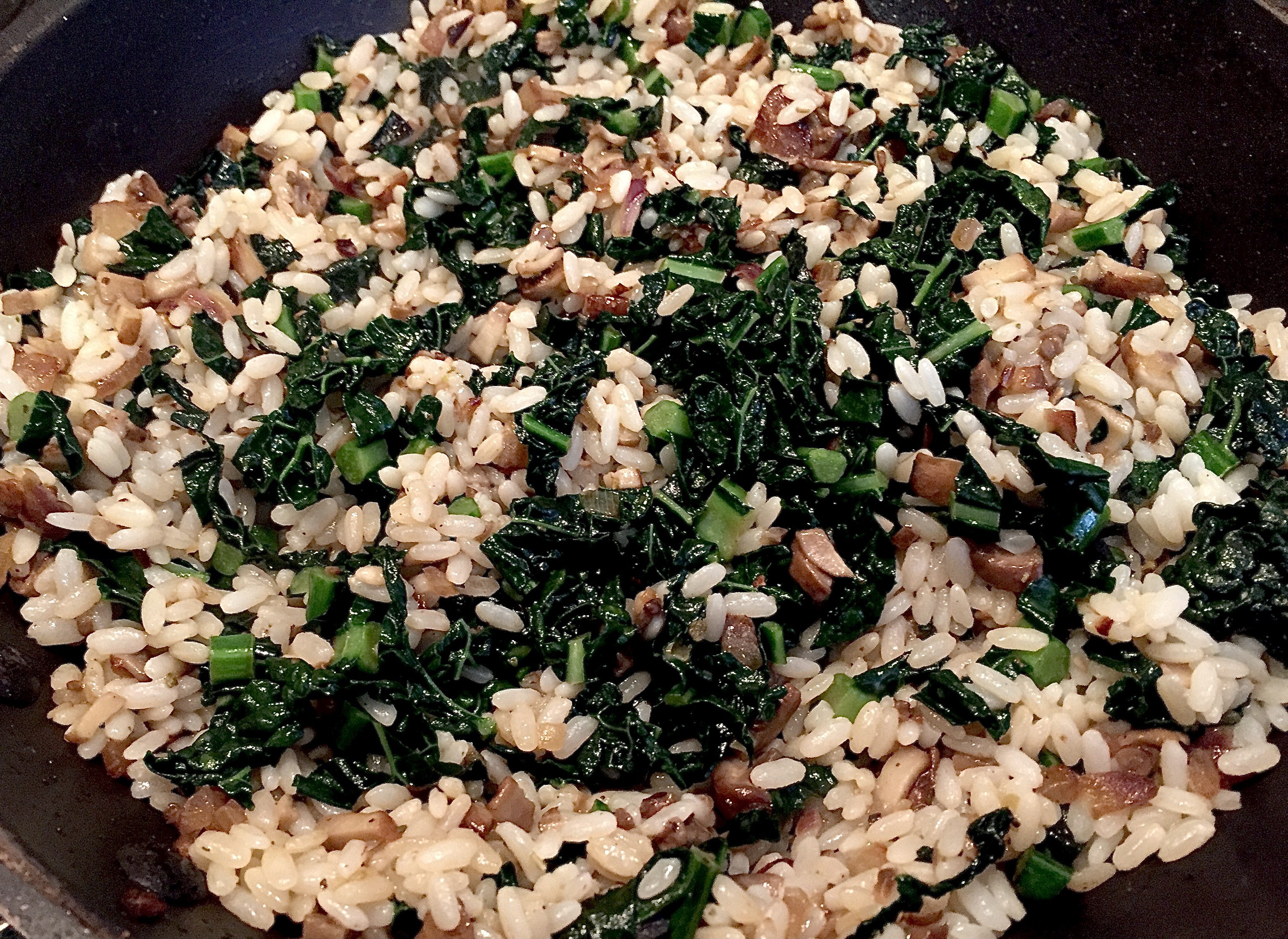Melt some butter or oil in a pan – I used butter for extra flavour – and fry off the onion until soft. Then add the mushrooms and green leaves and sauté for around 10 minutes, stirring occasionally. Add the cooked rice and season well with salt and black pepper.