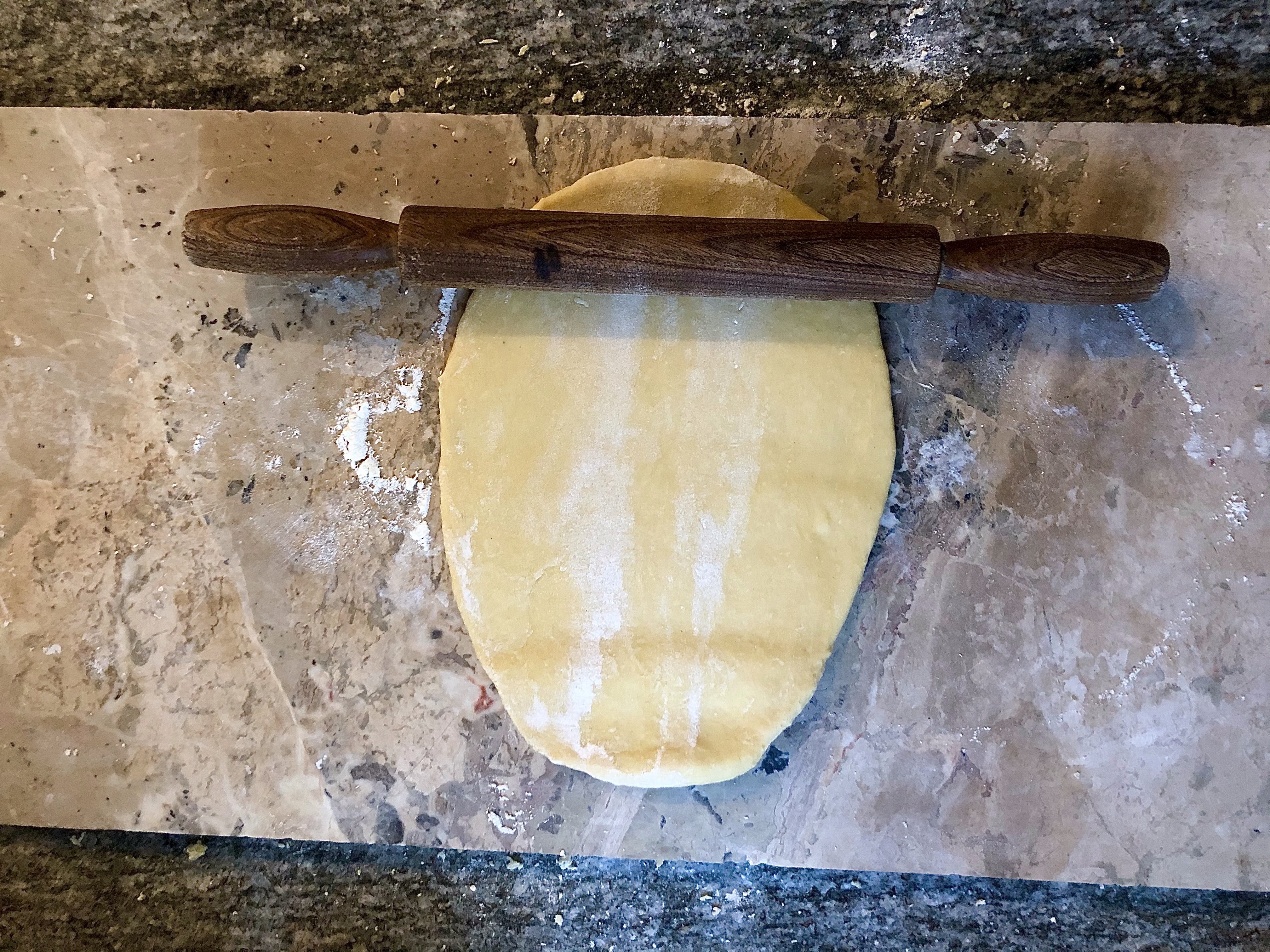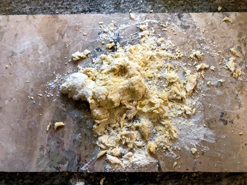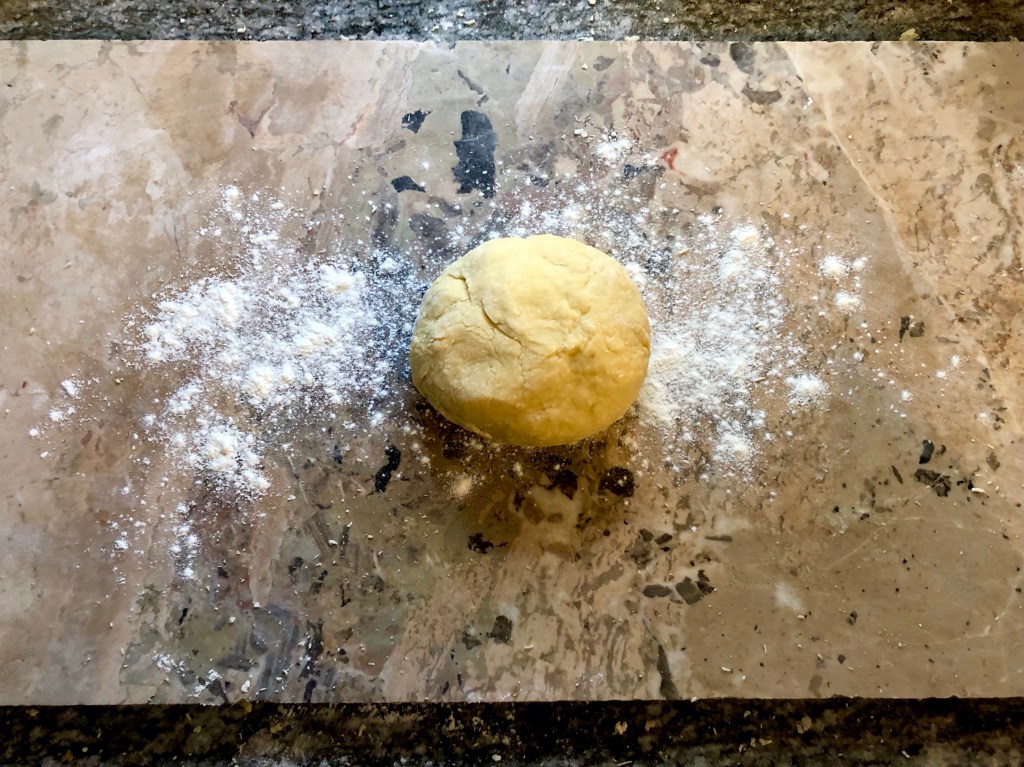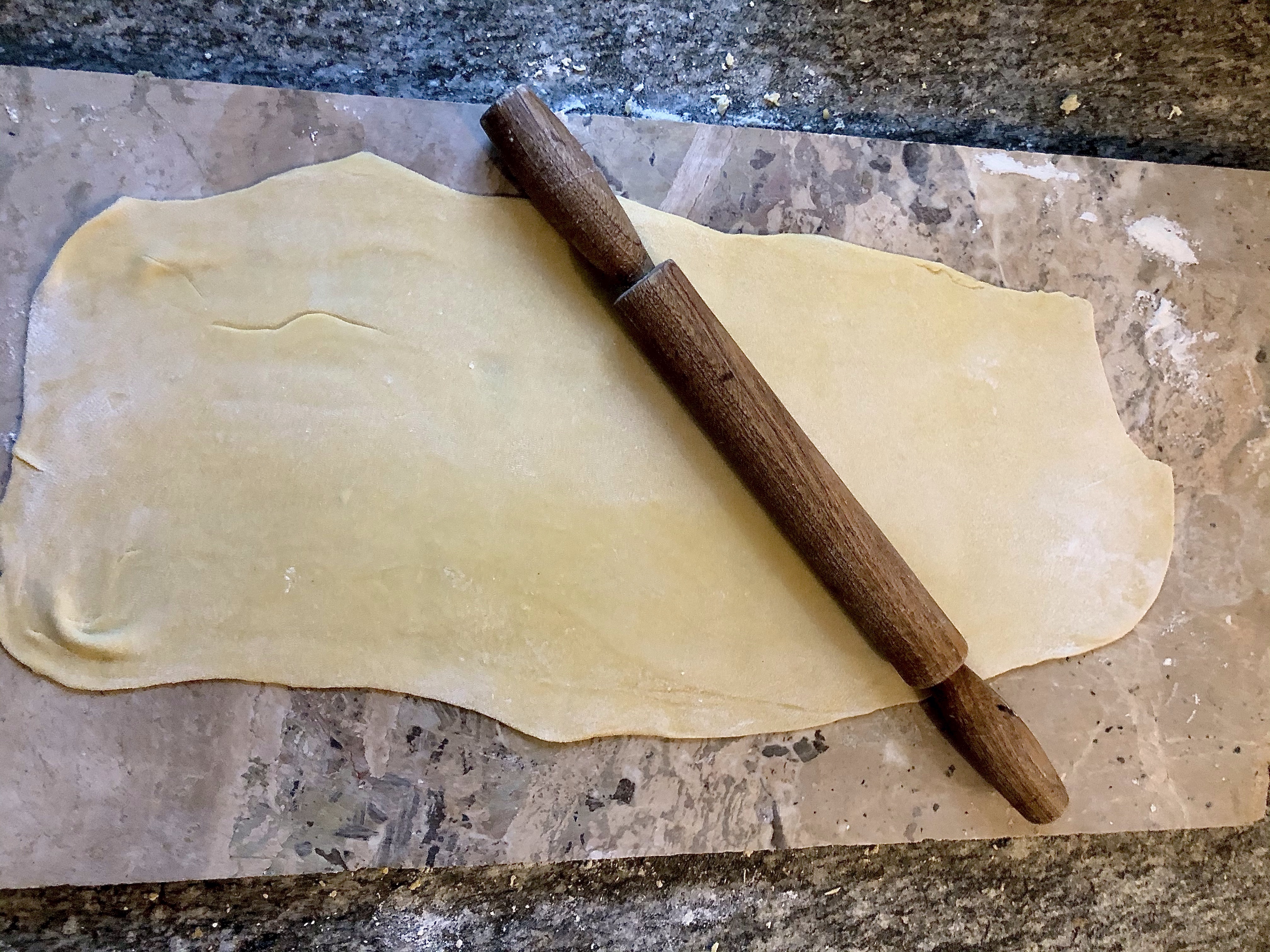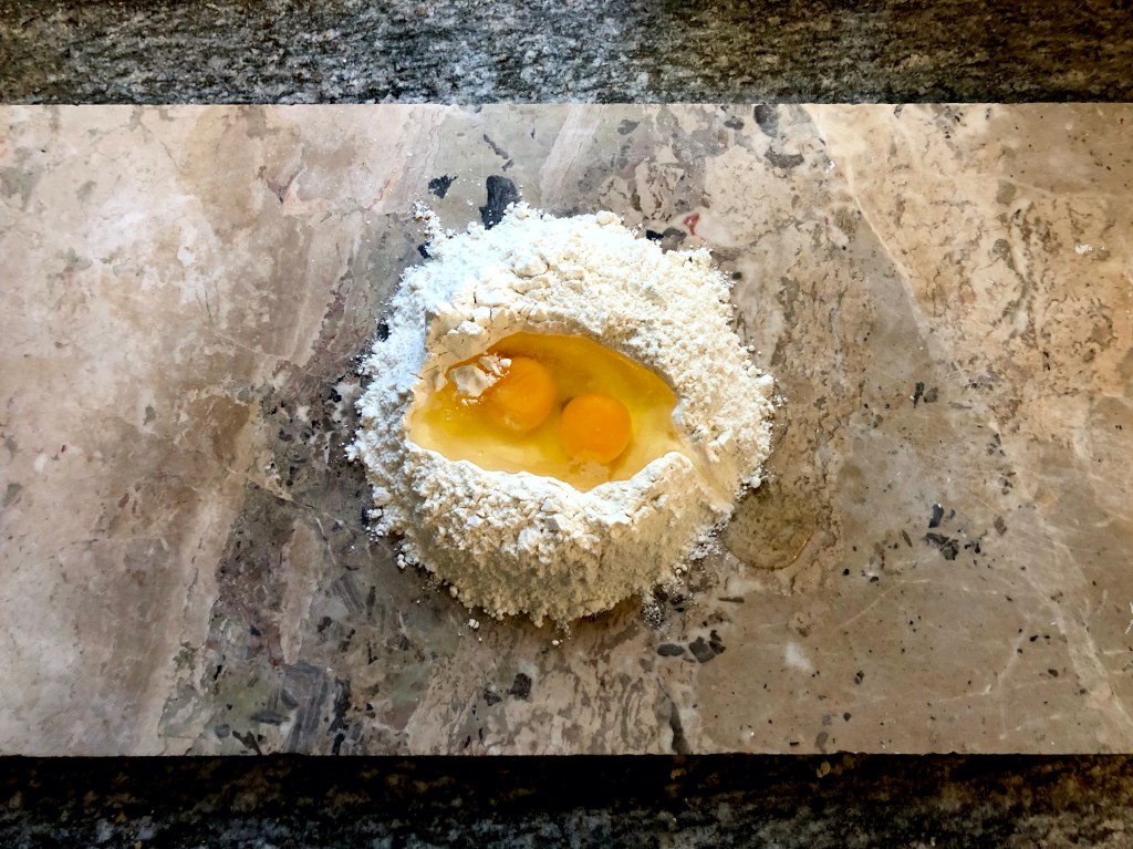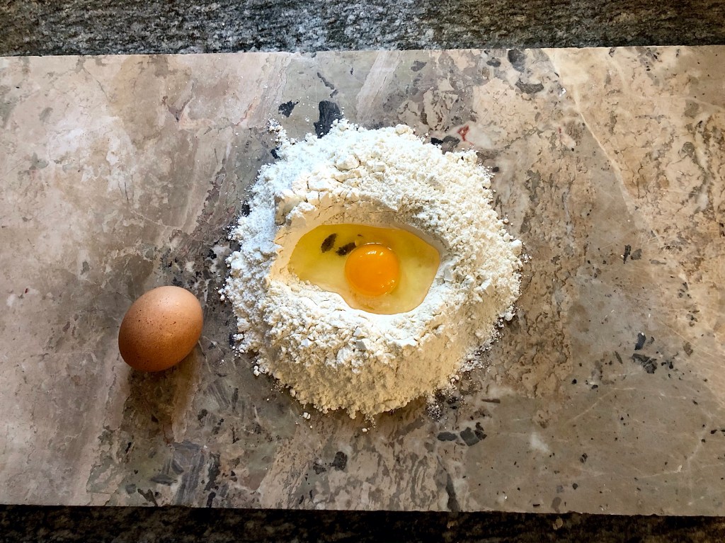 Using a fork, gently beat the eggs bringing in more and more of the flour as you go. If the yolks try to escape simply rebuild the wall with some of the flour! The mixture may seem too dry but keep going, using your hands to knead the mixture and bring it all together into a dough. If the mixture really won’t stick together and you have dry flour remaining you can add a little water.