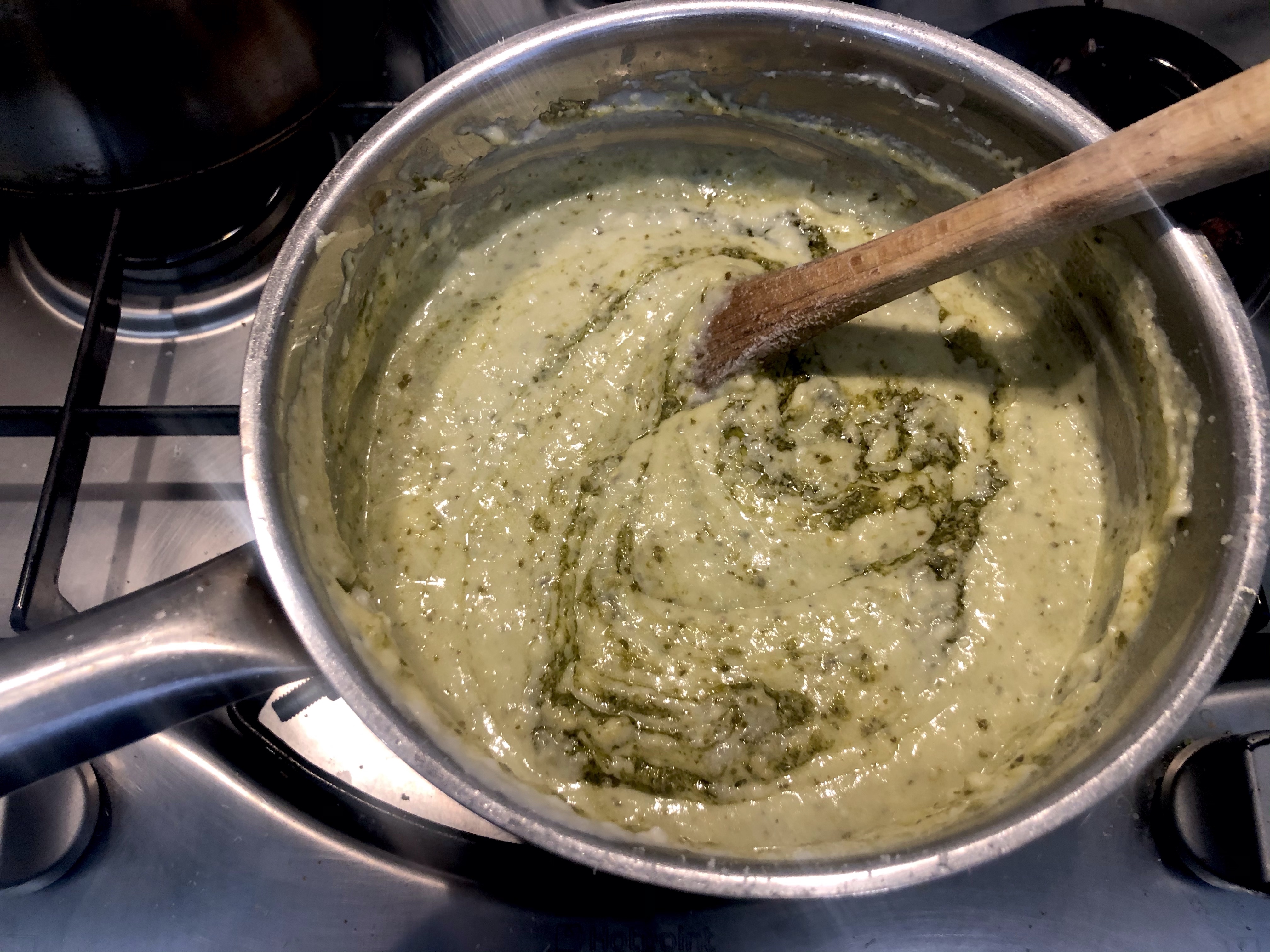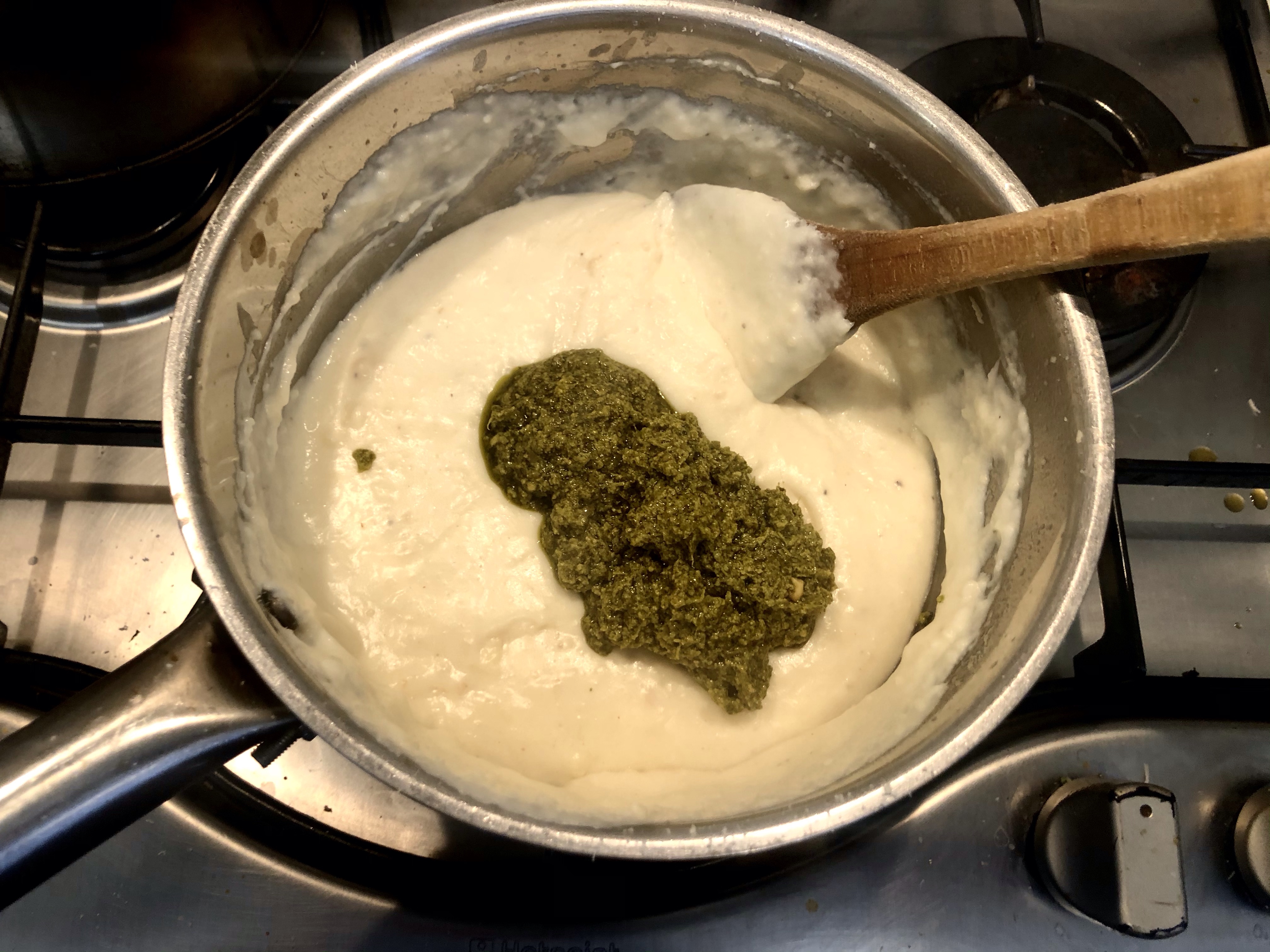 Switch to a wooden spoon and bring to sauce to the boil. Turn down the heat, add two tablespoons of pesto and the cheese, grated. Cook for a further 5 minutes, season to taste and remove from the heat.