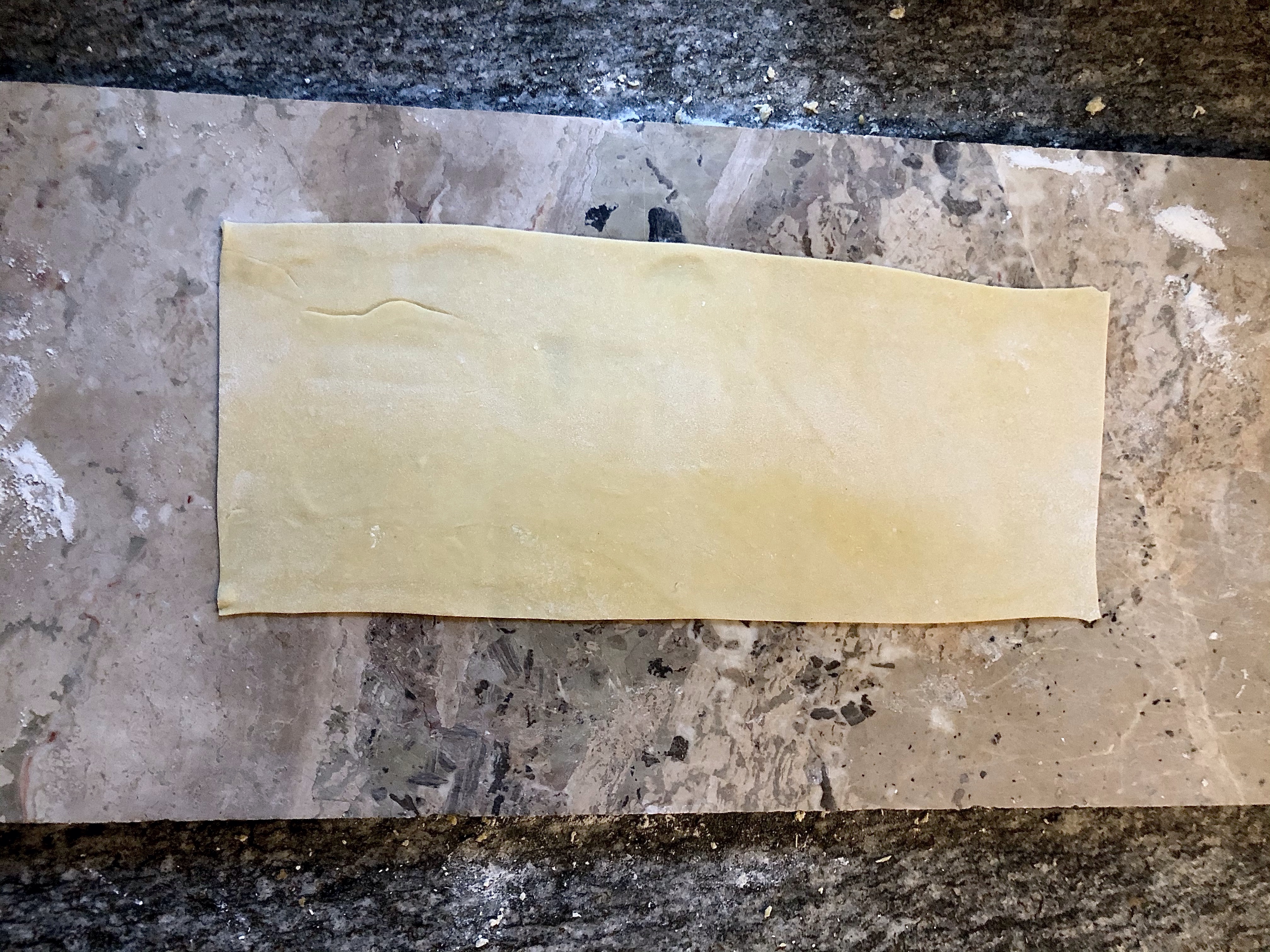 Cut the pasta dough in half and roll out thinly on a floured board or work surface. If the pasta is too thick it won’t cook properly so keep going until you have a large piece. Straighten the edges with a sharp knife and cut into rectangles for your cannelloni tubes. Repeat with the other piece of dough. You should end up with around 12-14 cannelloni shapes.