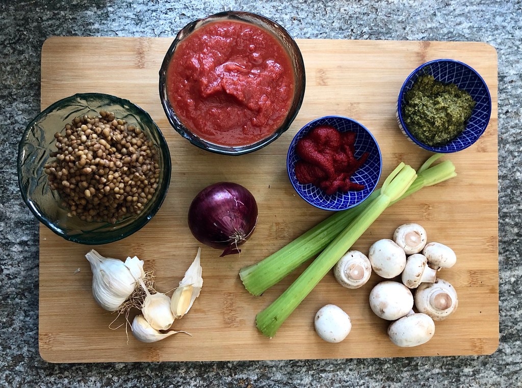 Add the tomato puree, chopped tomatoes, lentils and pesto. Stir together and bring to the boil. Simmer for 10 minutes, add a splash of soy sauce or balsamic vinegar and season to taste. Simmer gently for a further 5 minutes and then remove from the heat and allow to cool.