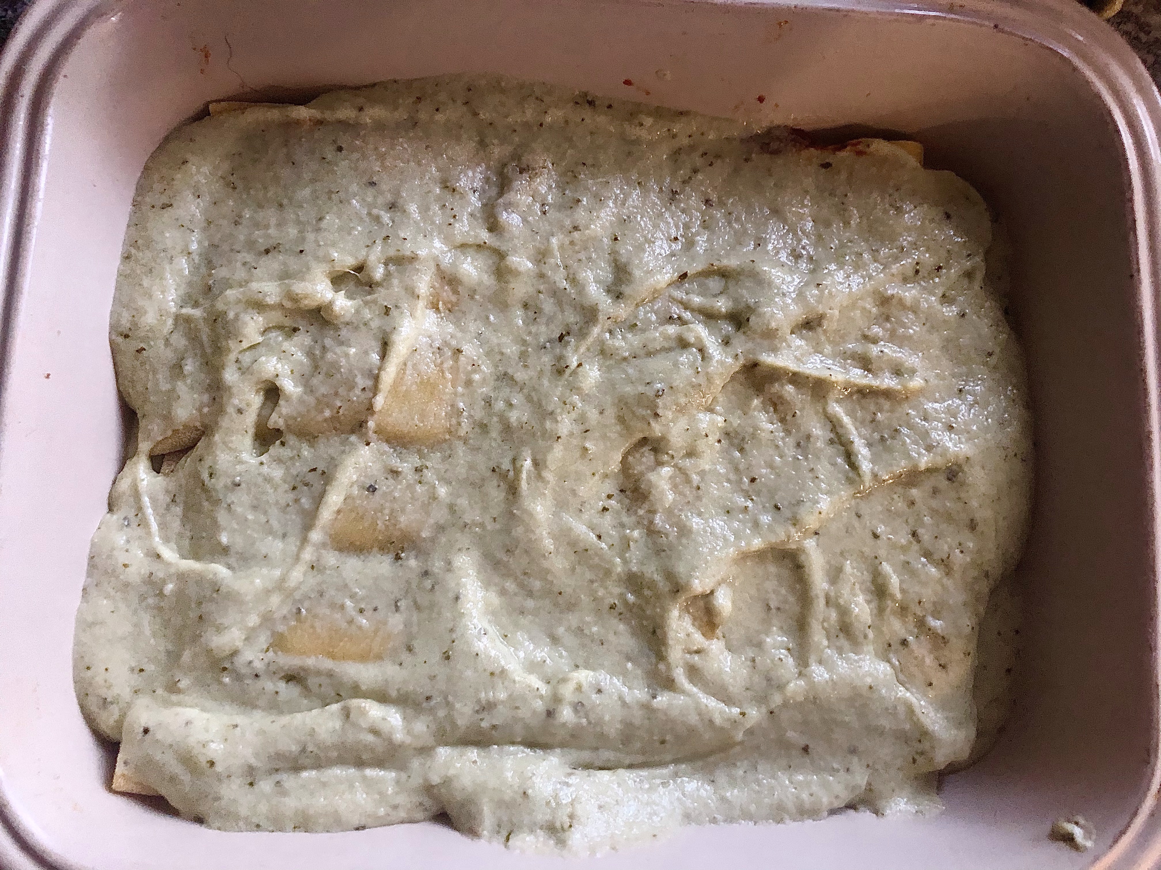 Pour around half of the cheesy pesto sauce in the bottom of a square or rectangular baking dish. Place 1-2 desertspoons of the cooled down ragu lengthways in the middle of each piece of pasta, roll into a tube and place in the baking dish on top of the sauce. Repeat until the dish is full. Any leftover ragu will keep in the fridge for a week or in the freezer for up to 6 months. Cover the cannelloni with the remaining sauce. If you have any parsley or fresh herbs to hand these can be chopped up finely and sprinkled on top for extra colour.