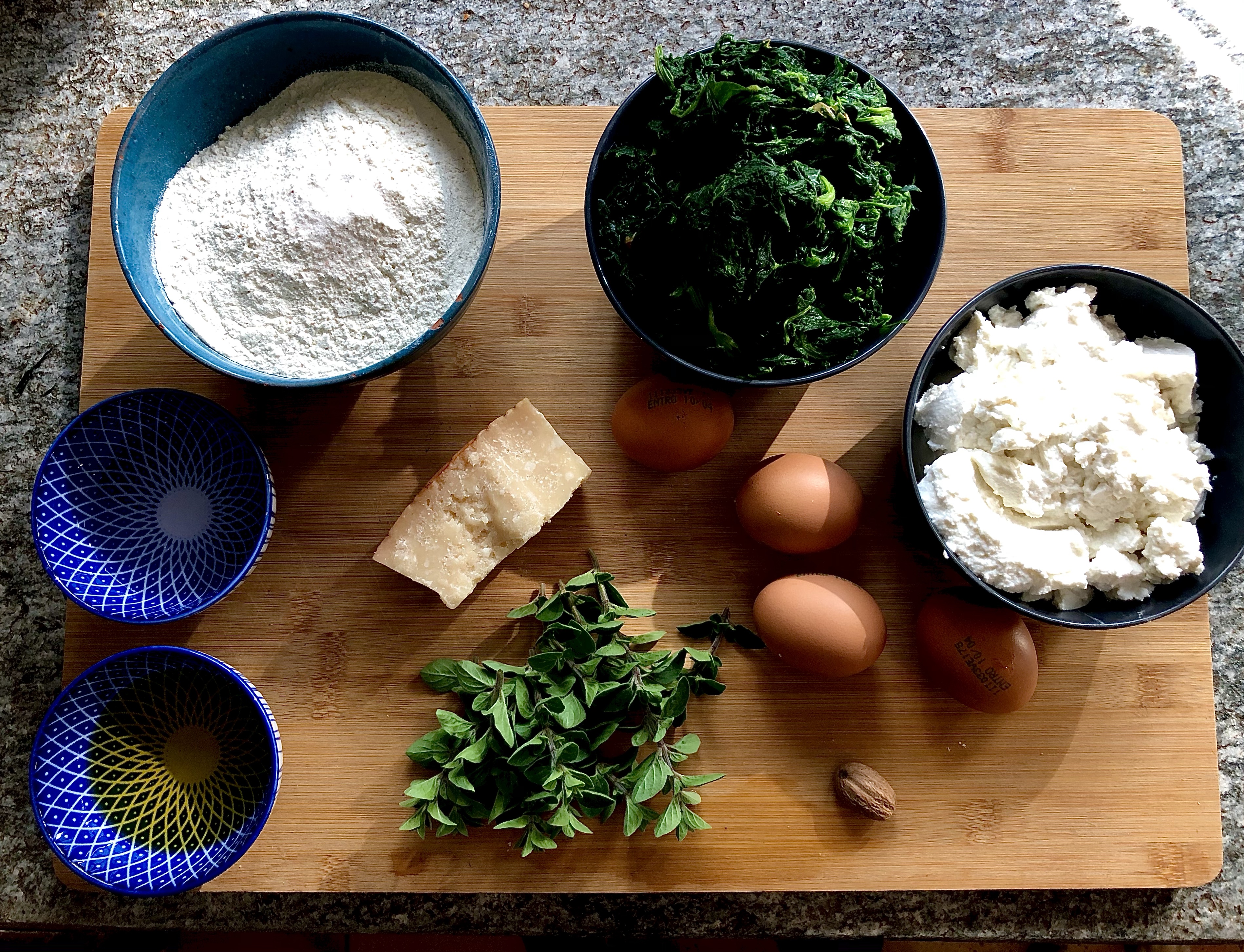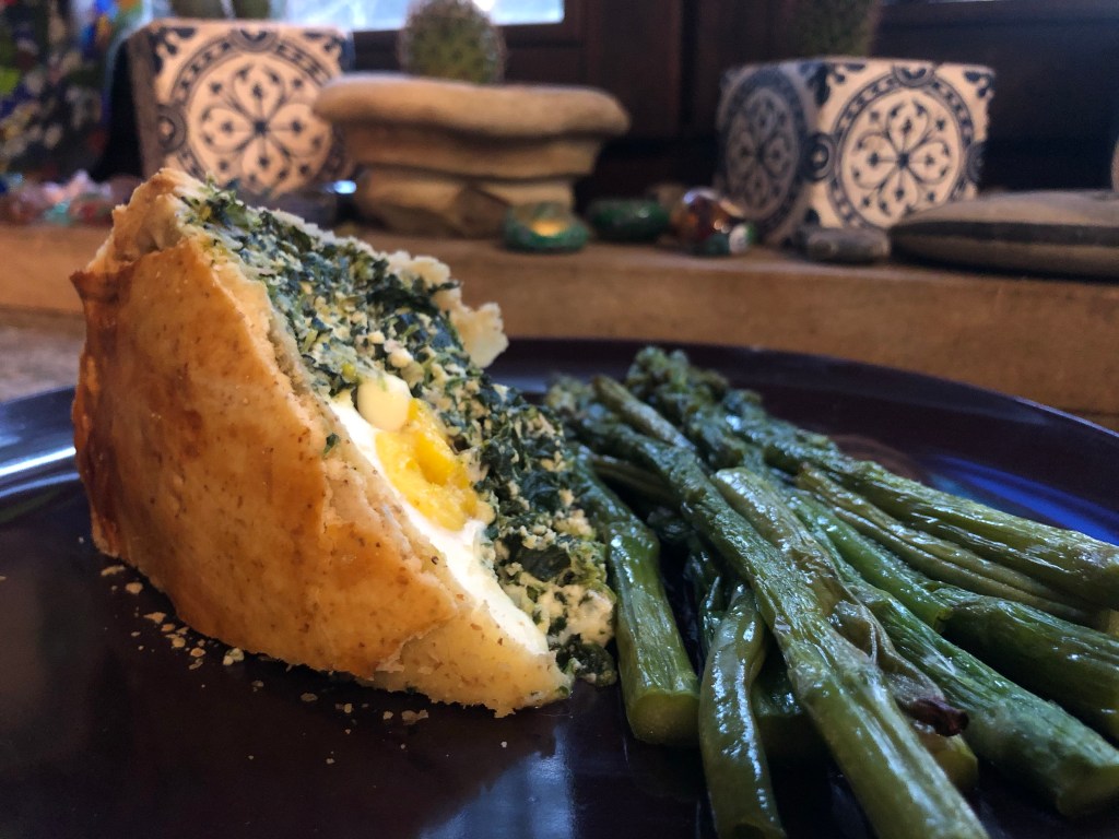 Torta Pasqualina – or Easter Cake – dates back to the 1500s and originates from Liguria which lies just to the South of us here in Piemonte. It’s not actually a cake but a savoury pie made with layers of thinly rolled pasta brisee, a shortcrust pastry made with olive oil instead of butter, and filled with a rich mixture of ricotta and spinach flavoured with fresh marjoram and nutmeg. The addition of whole eggs which bake in the oven creates a wonderful effect when you cut the pie open, making it the perfect lunch or picnic food for Pasquetta (Easter Monday).