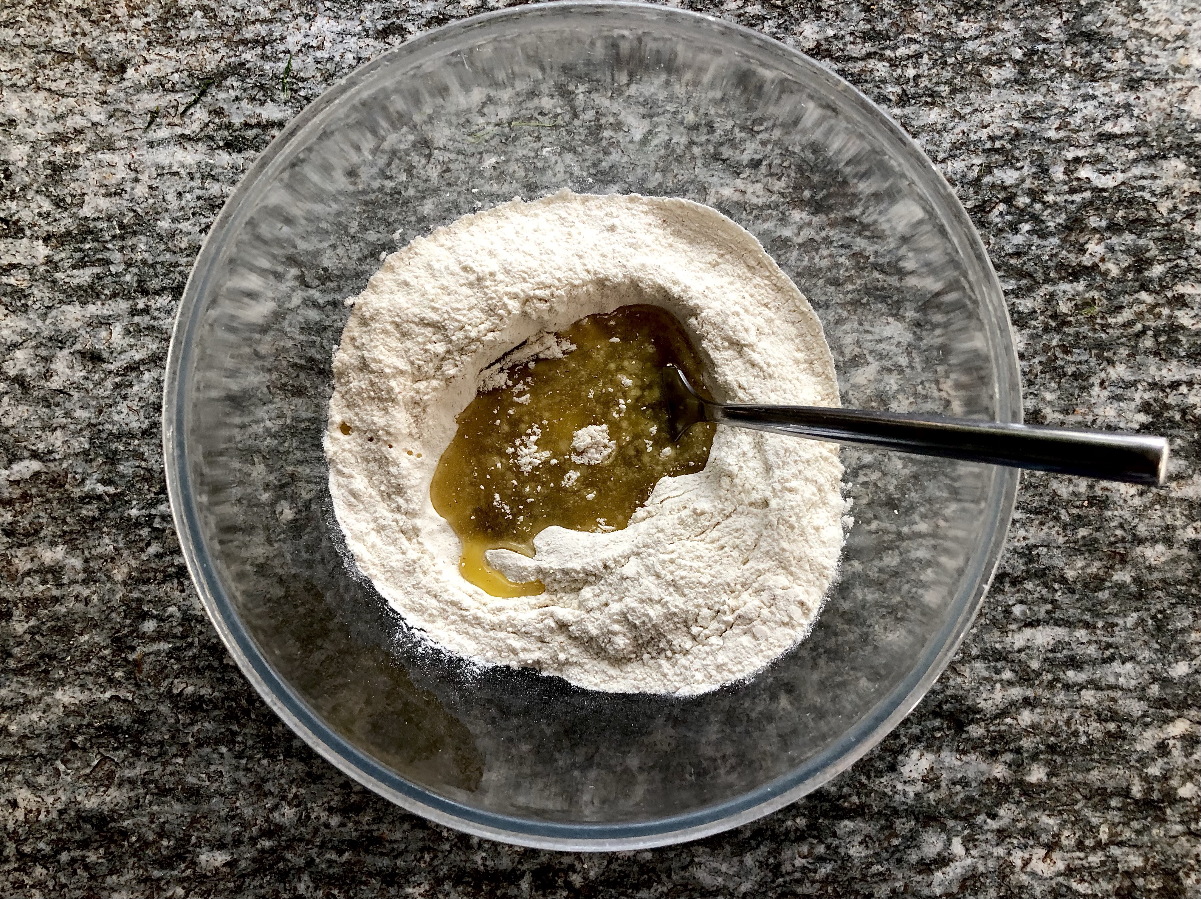 Start by making the pasta brisee, which is basically a shortcrust pastry made with olive oil. Put the flour in a bowl with half a teaspoon of salt then stir in the oil so that the mixture resembles breadcrumbs. Add the water and mix by hand until you have a firm dough. If the mixture seems crumbly add a little more water.