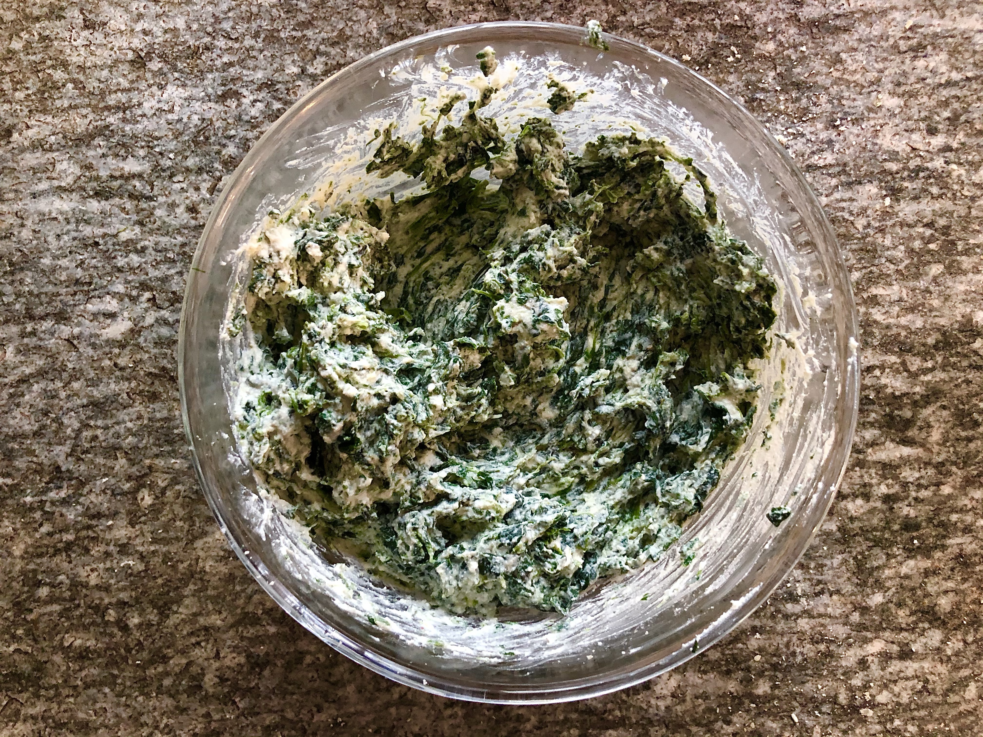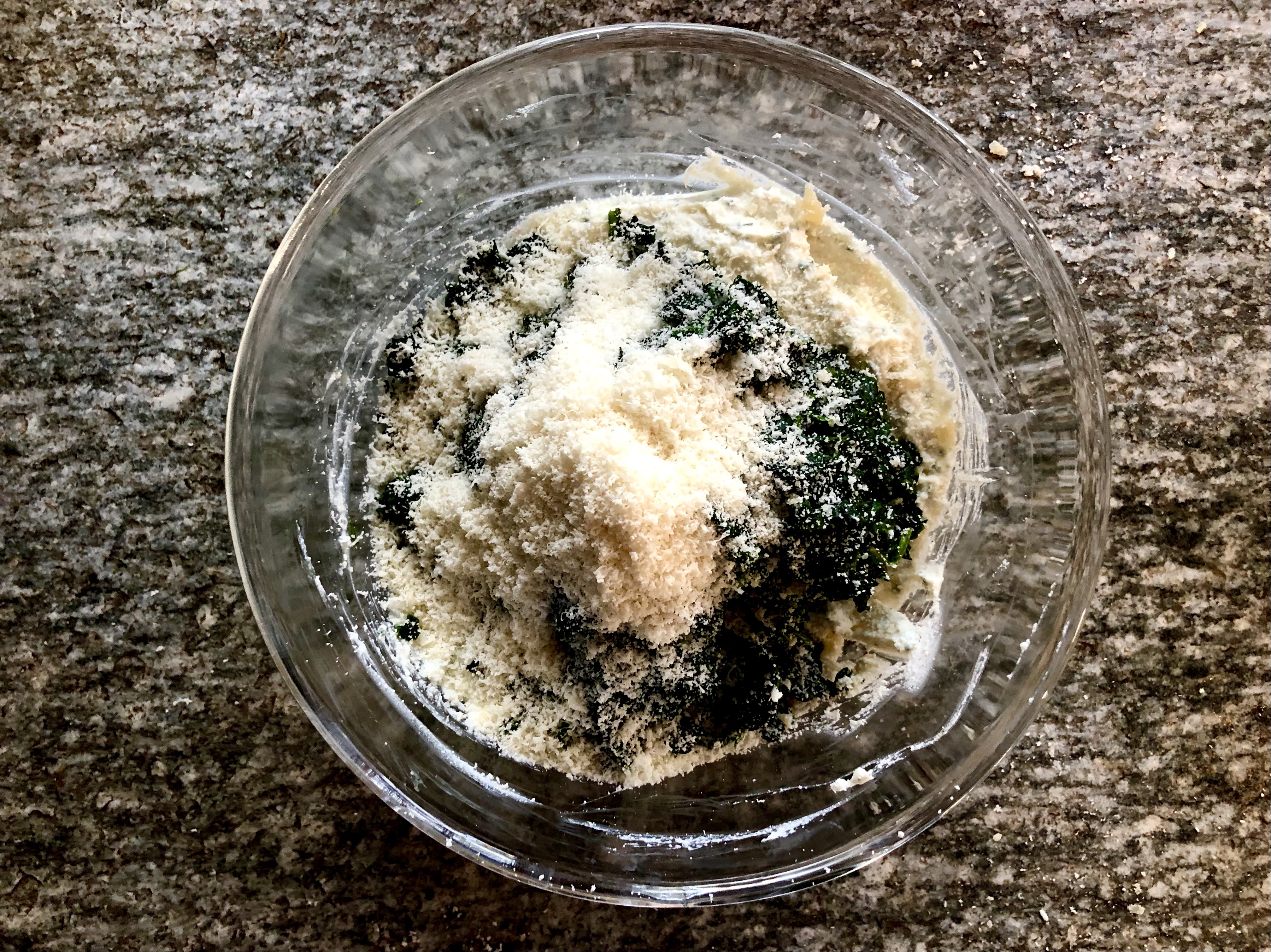 Drain any excess water from the ricotta and place in a large bowl. Chop the marjoram and add it to the ricotta with a beaten egg and the grated Parmesan cheese. Stir well then chop the spinach and add to the mixture.