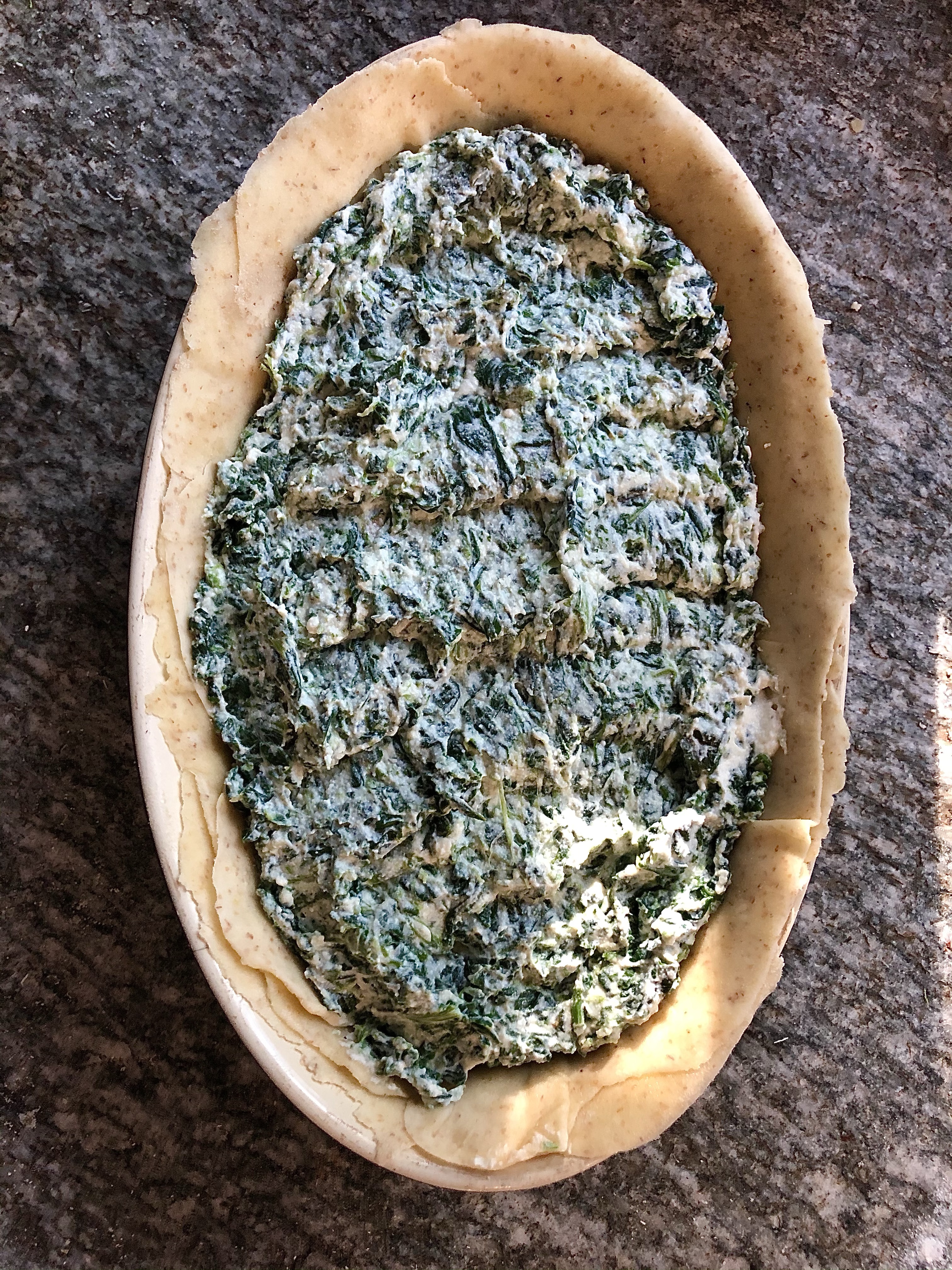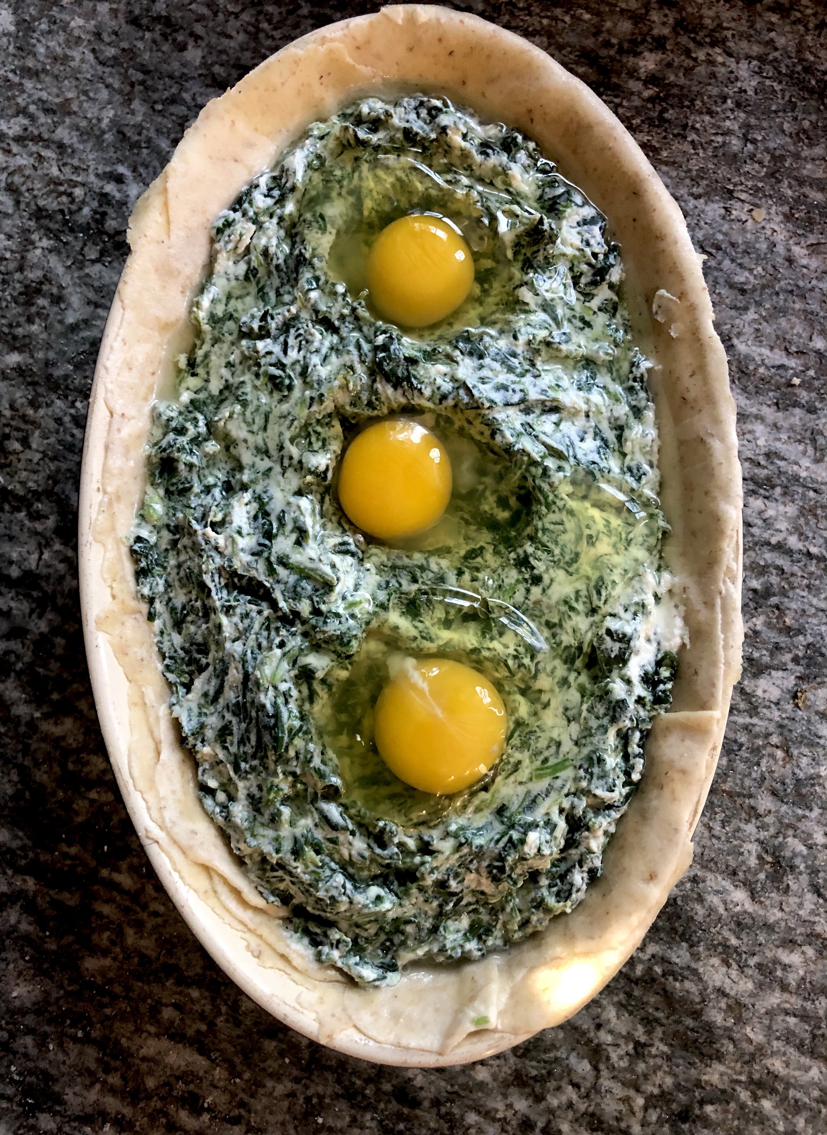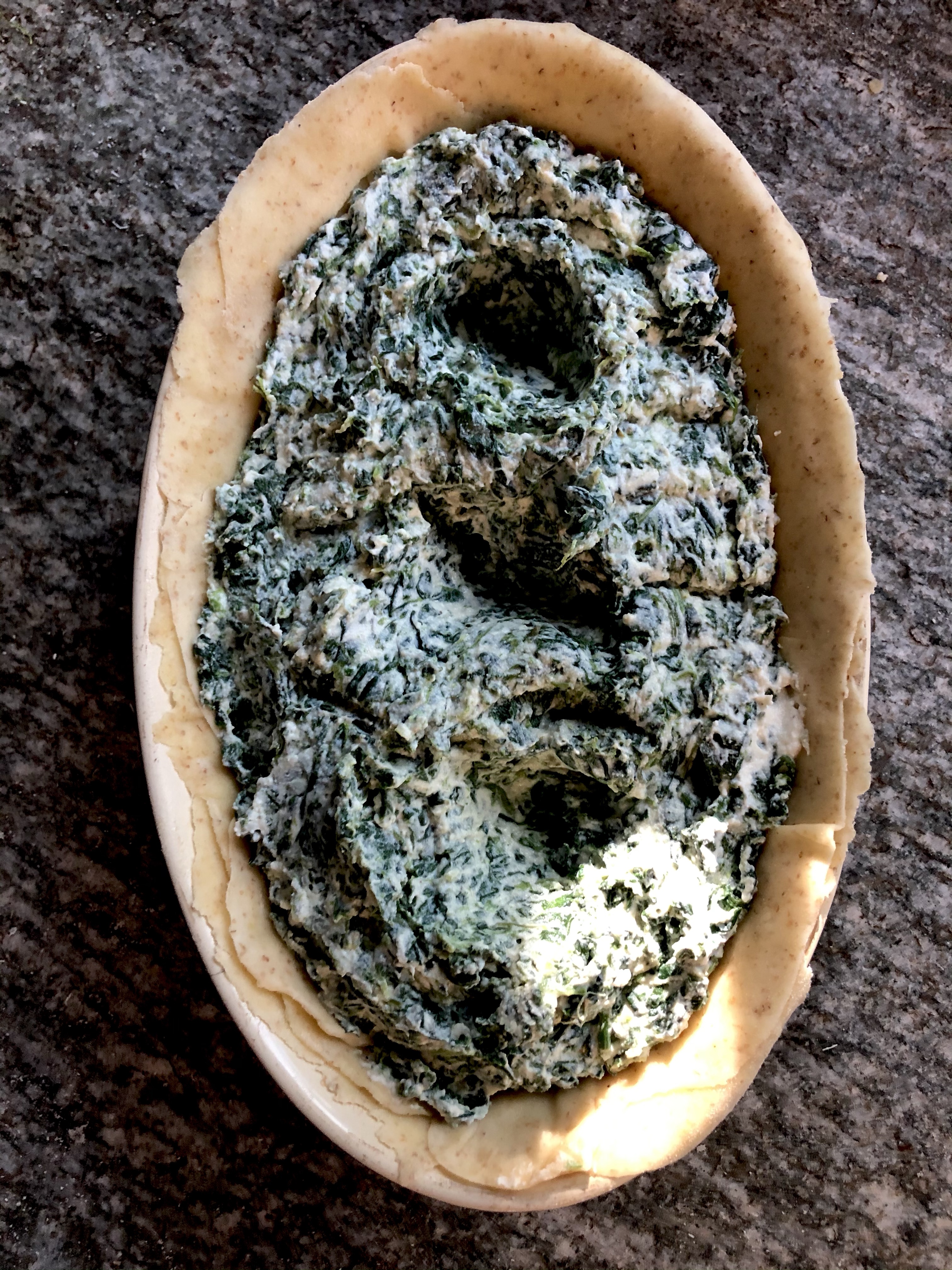 Ideally you need a deep round bake or pie tin but I didn’t have one so I used an oval dish which I greased well with olive oil before starting. Roll three of the pastry balls out thinly on a floured board to fit the dish and place each one on top of the other, brushing each layer with olive oil as you go. The original recipe for Torta Pasqualina apparently includes 33 sheets of pasta brisee, one representing each year of Christ’s life, but in the interests of time and our waistlines I made my dish with six, three for the base and three for the top.
