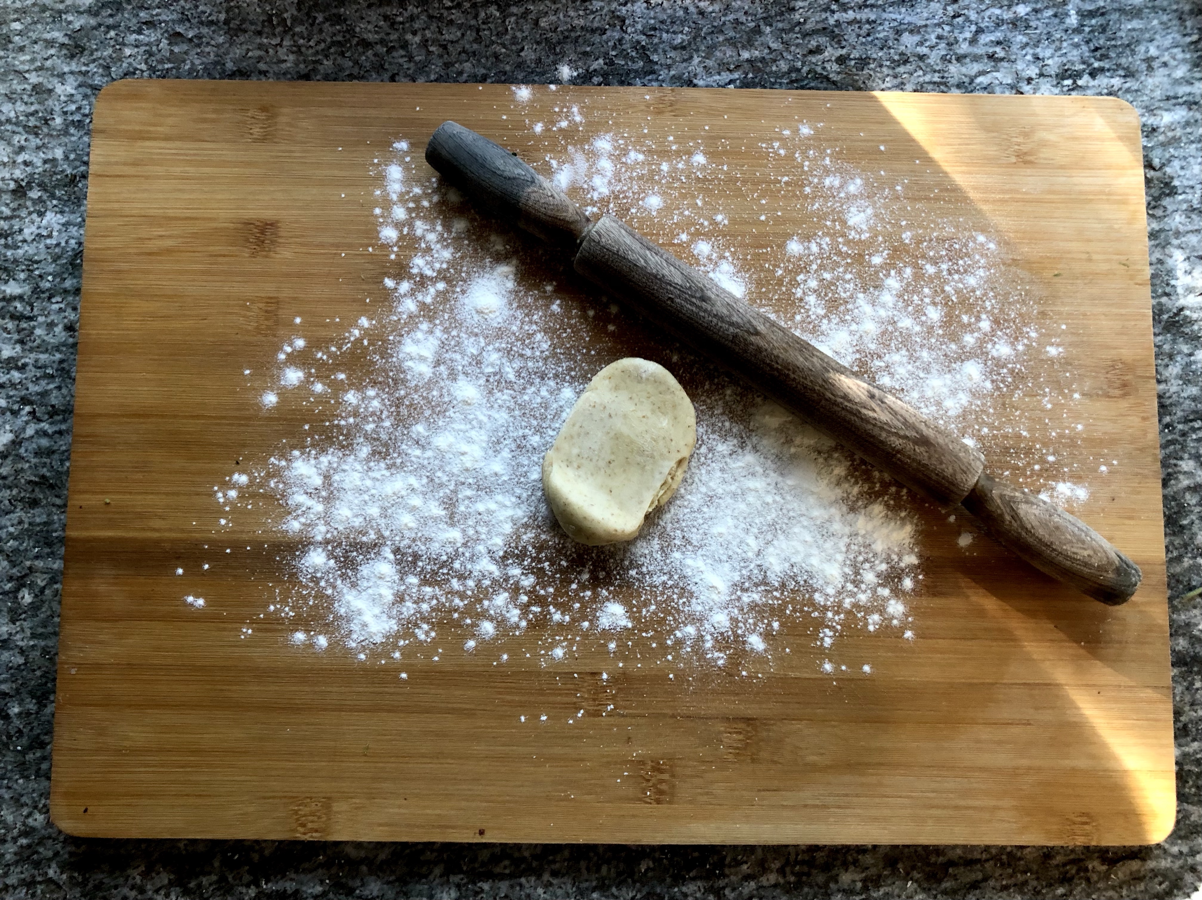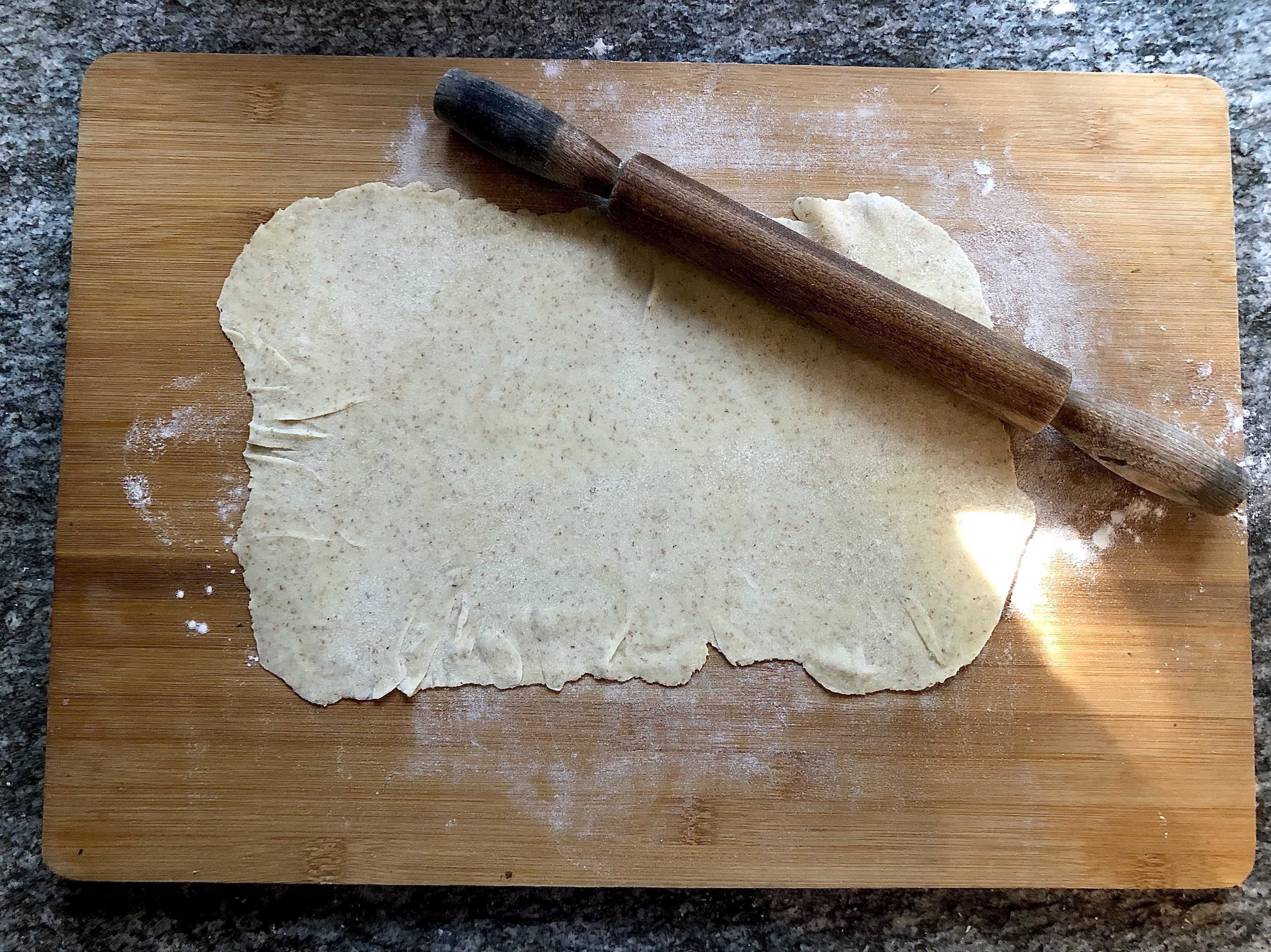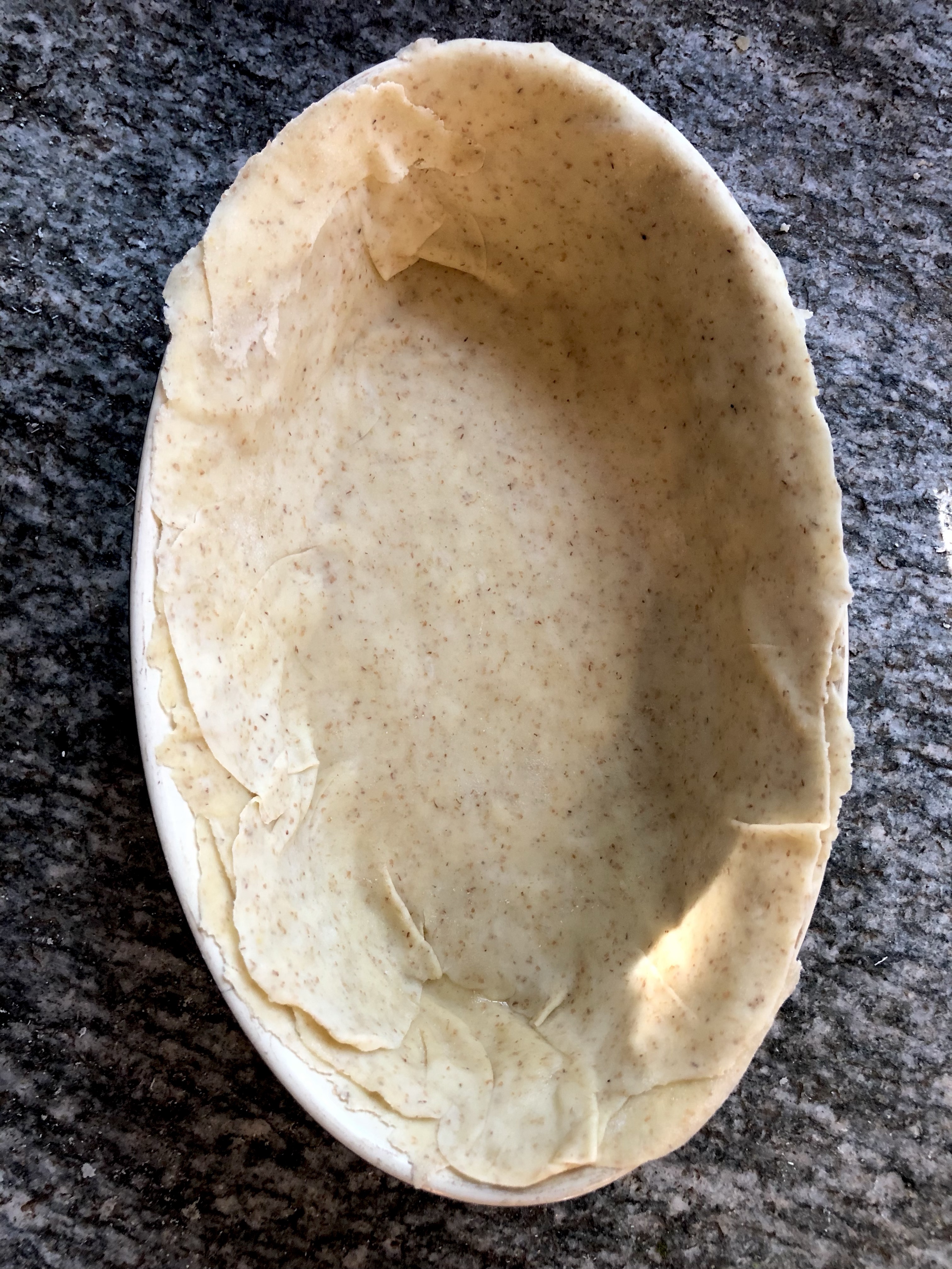 Ideally you need a deep round bake or pie tin but I didn’t have one so I used an oval dish which I greased well with olive oil before starting. Roll three of the pastry balls out thinly on a floured board to fit the dish and place each one on top of the other, brushing each layer with olive oil as you go. The original recipe for Torta Pasqualina apparently includes 33 sheets of pasta brisee, one representing each year of Christ’s life, but in the interests of time and our waistlines I made my dish with six, three for the base and three for the top.