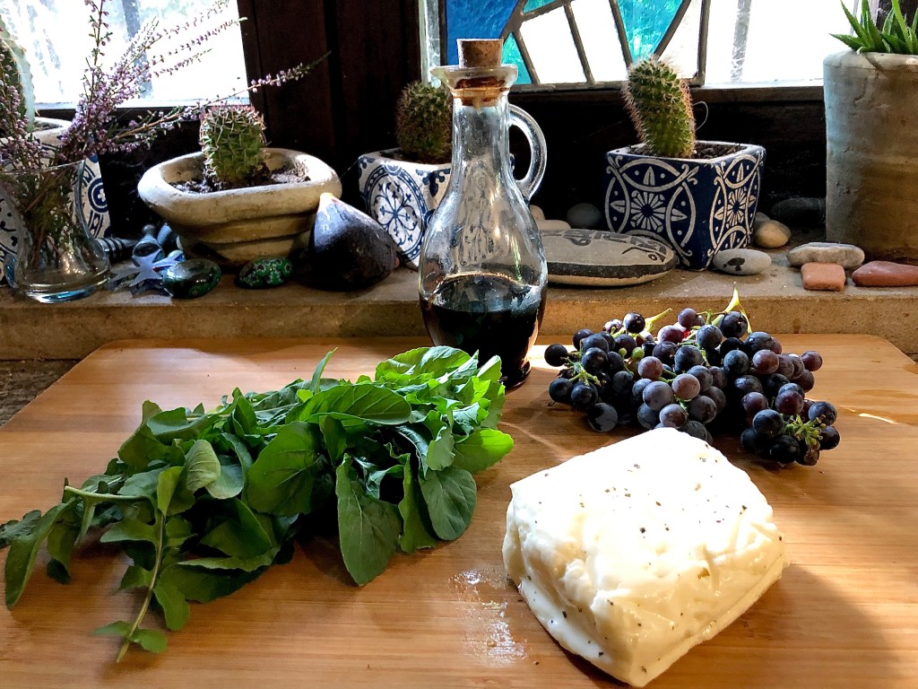 I found this recipe a few weeks ago on Fuss Free Flavours when I was looking for something to do with the piles of red grapes picked from my vine and the block of halloumi cheese that I found in my local supermarket during their ‘Greek week’. I adore halloumi, it’s squeaky texture and creamy taste, but it’s rare to come across it in this part of rural Italy. This recipe is quick and simple – just ten minutes from start to finish – and it also makes great use of the bottle of pomegranate molasses that’s been sitting in my cupboard since my last trip to Turkey. The tartness of the molasses and sweetness of the grape juice make a delicious dressing that works very well with the salty halloumi.