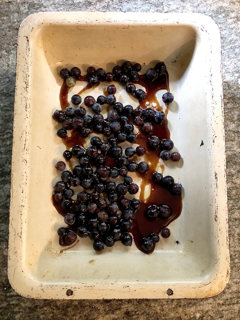 Place the grapes in a small ovenproof dish and drizzle with olive oil and pomegranate molasses into a small oven proof dish. Bake in a hot oven for about 10 minutes or until the grapes are soft.
