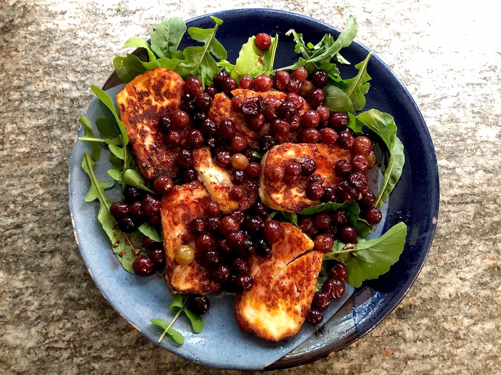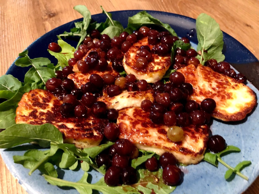 Arrange the halloumi slices on a bed of salad leaves and spoon the grapes and pomegranate sauce over the top. This is a great sharing plates which serves two.